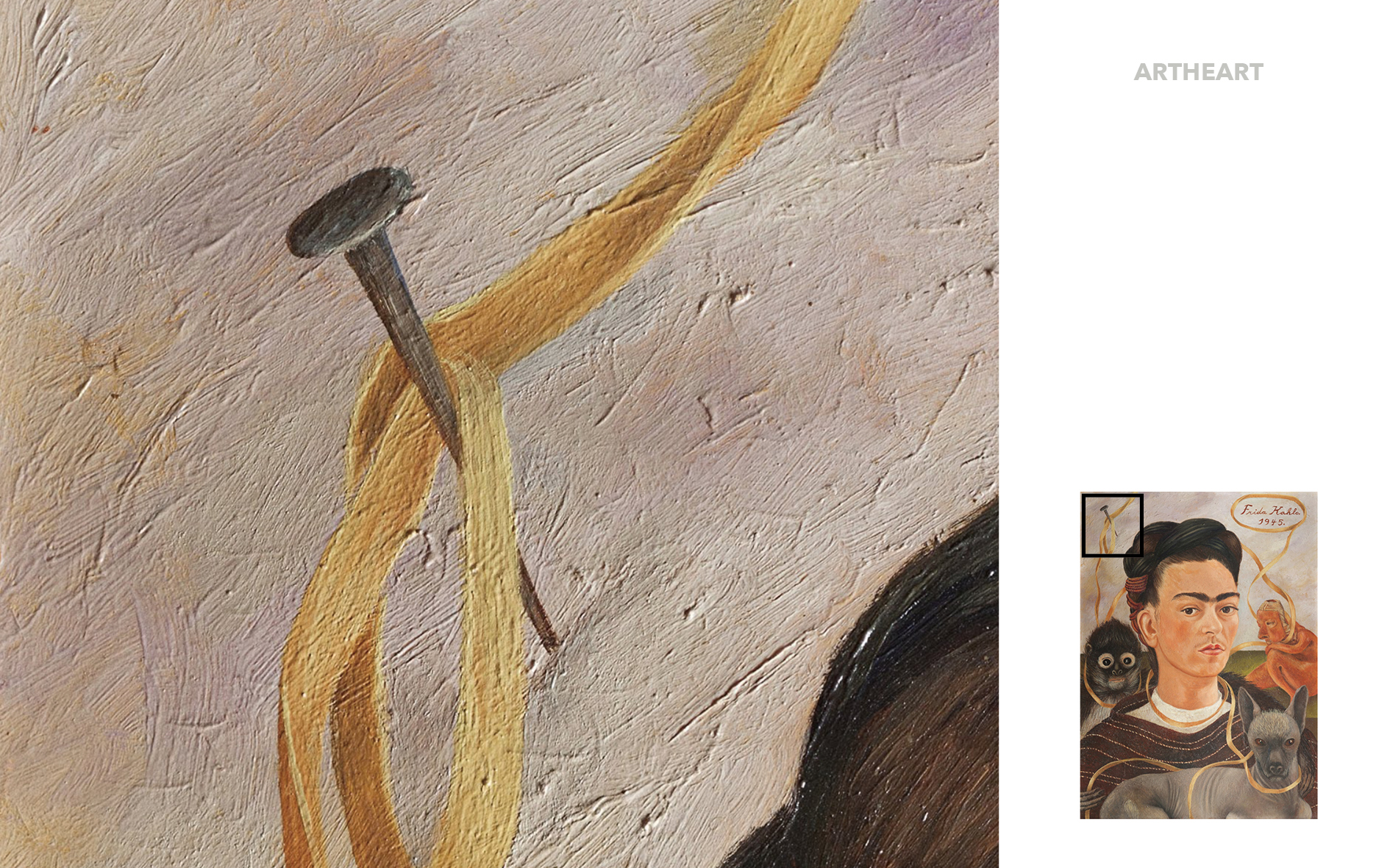 이 모든 것을 엮는 리본의 한쪽 끝은 프리다의 서명을 감싸고 다른 쪽 끝은 그림의 배경을 형성하는 베이지색 구름을 관통하는 못에 감겨 있다.