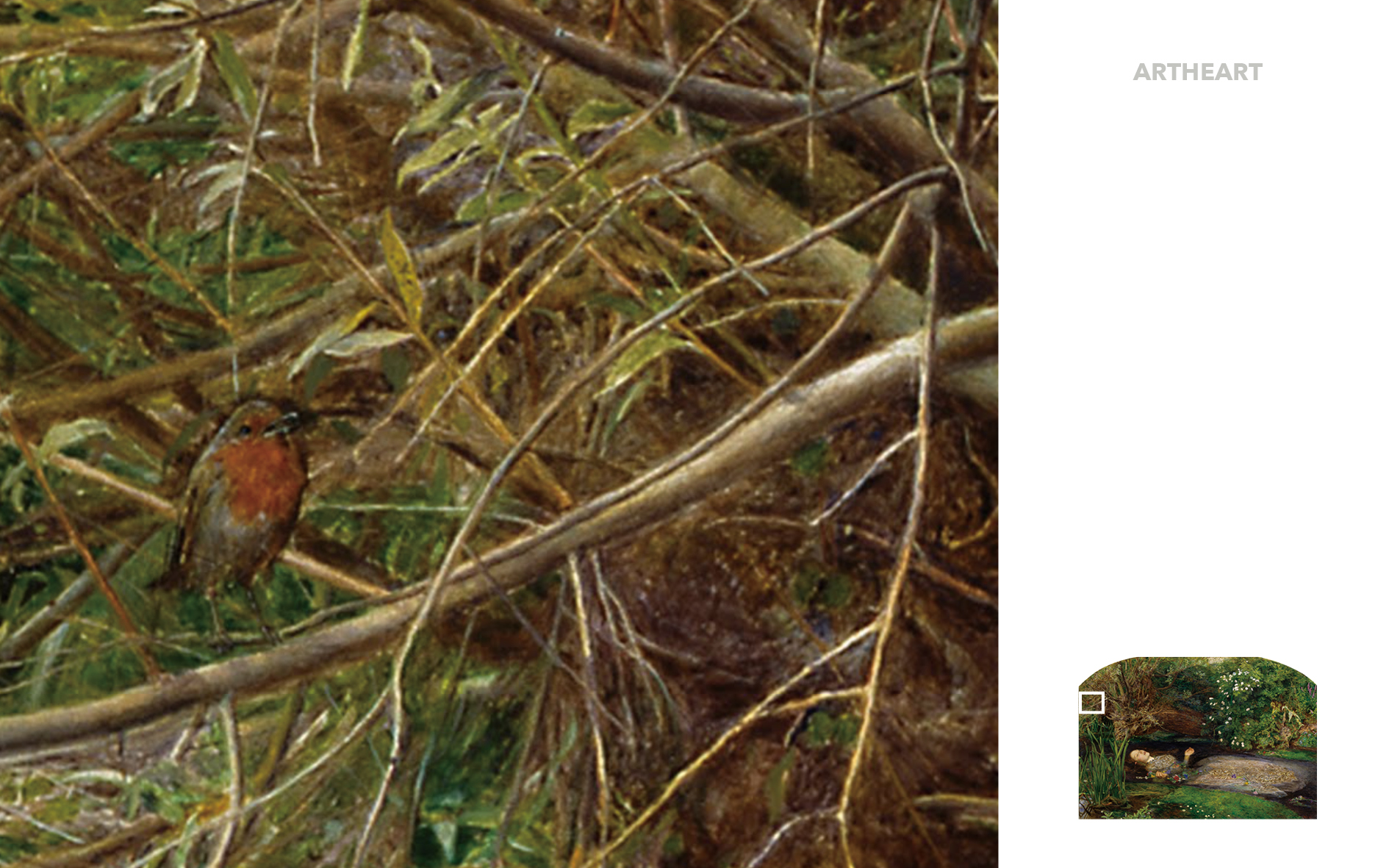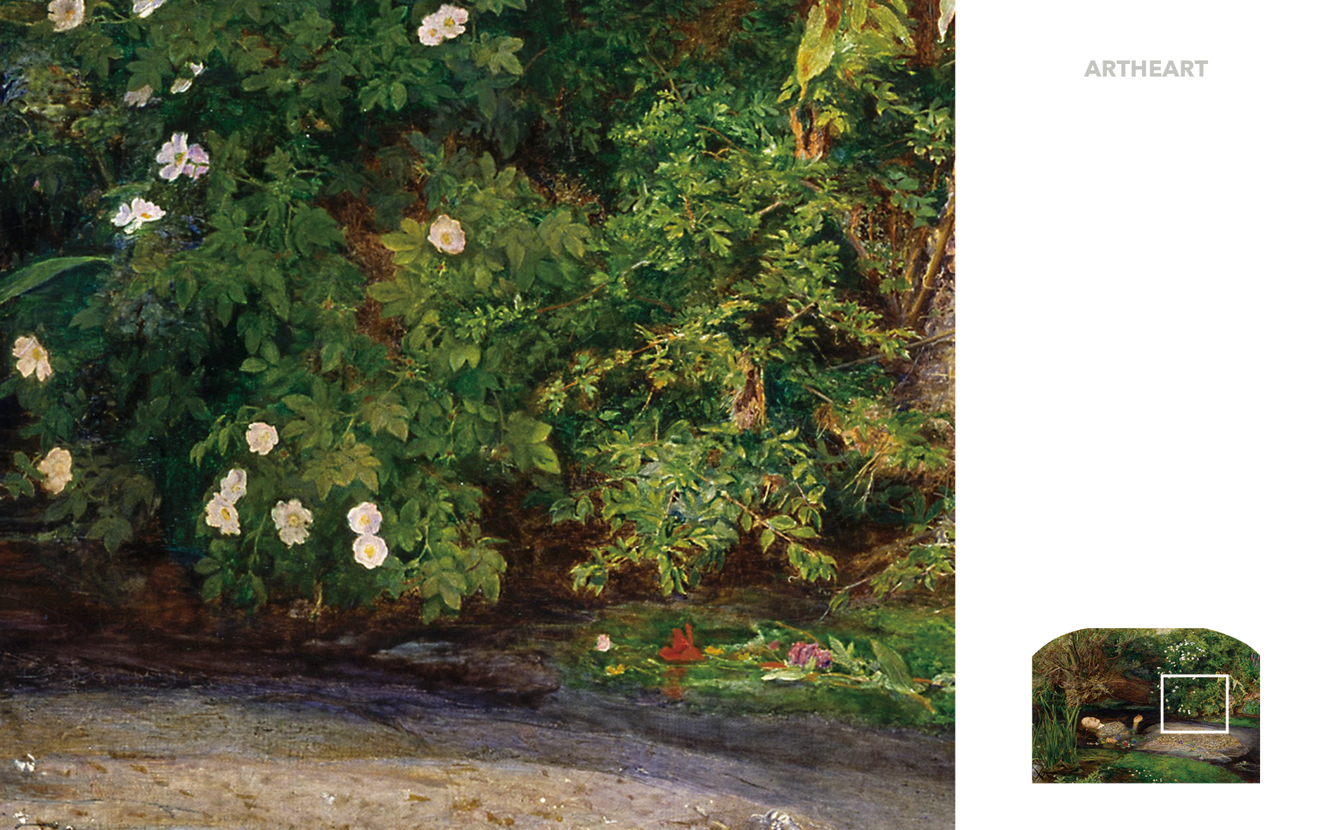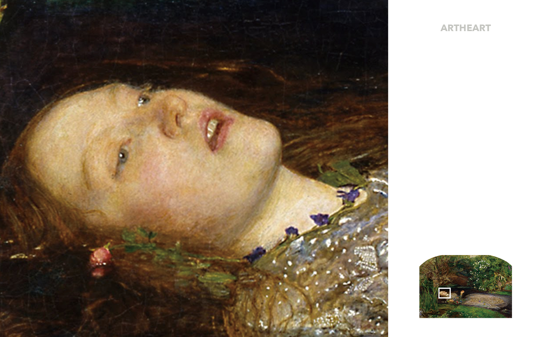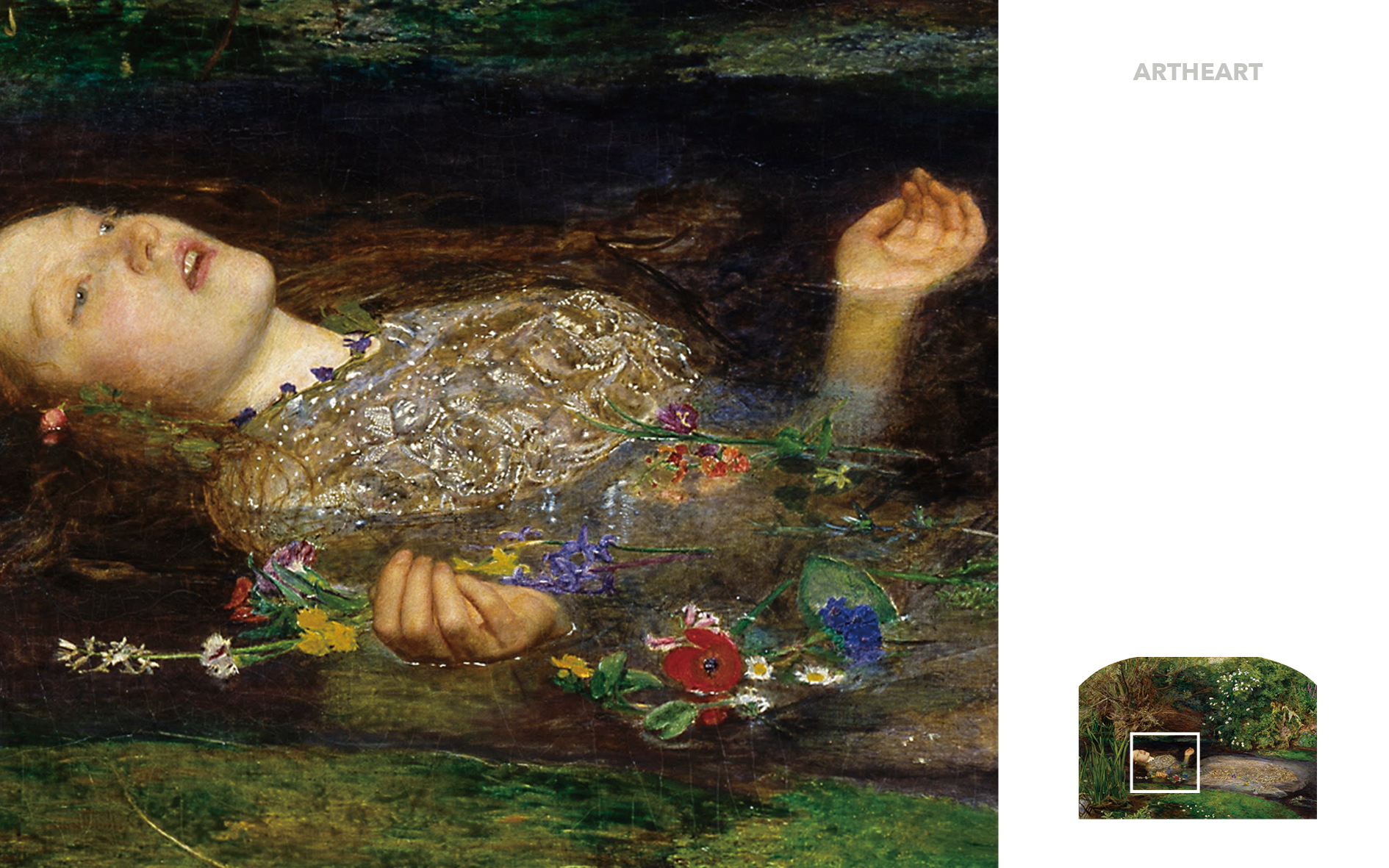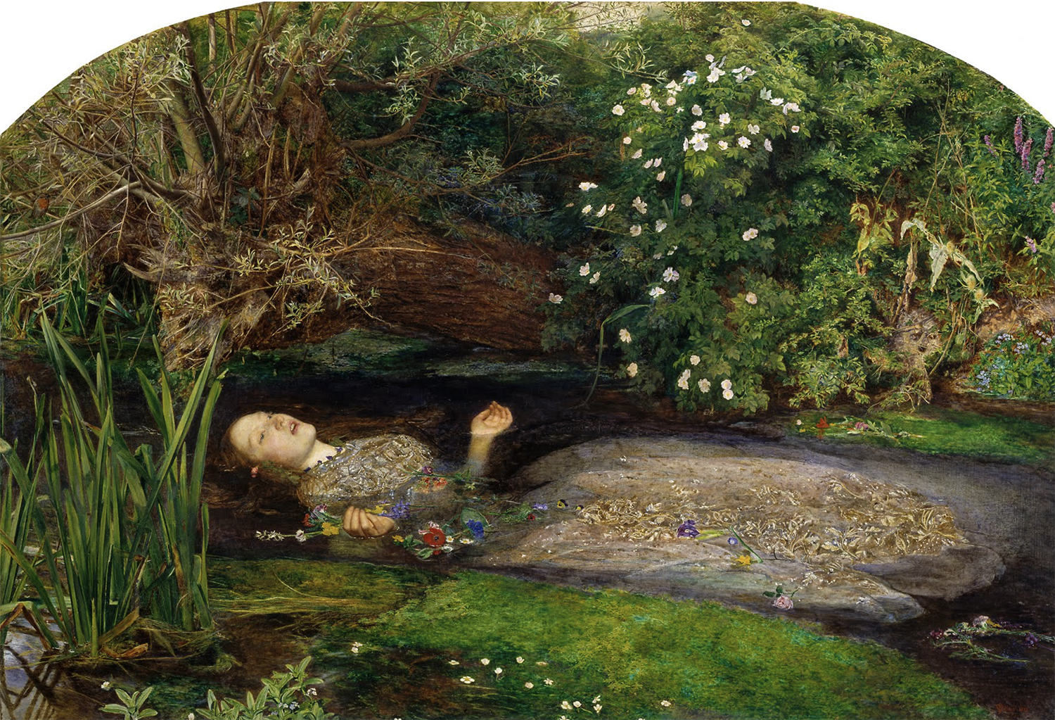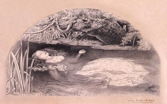 존 에버렛 밀레이는 셰익스피어의 희곡 햄릿에 나오는 한 장면을 그렸다. (아버지가 연인인 햄릿에게 살해당한 후 슬픔에 휩싸인 그녀는 스스로 목숨을 끊는 모습) 그녀 주위의 여러 종류의 꽃과 식물은 오필리아의 운명을 암시하는 상징의 의미를 담고 있다. 이 그림은 당대에 만들어진 자연에 대해 가장 정확하고 정교한 연구 중 하나로 여겨졌다.