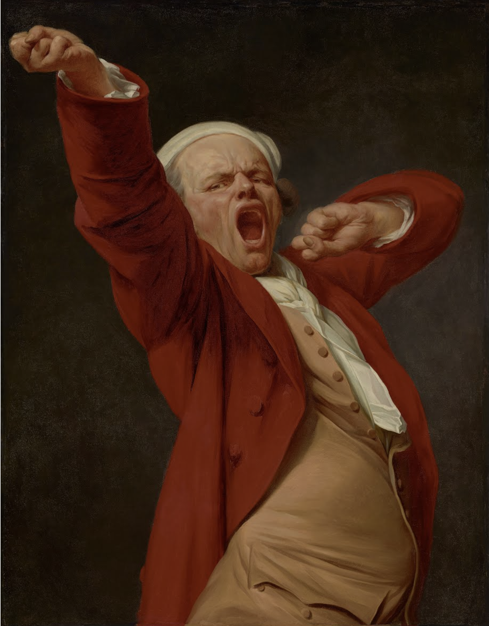 조제프 뒤크뢰는 기지개하고 하품하는 유머러스한 자신를 표현함으로써 다소 비정통적인 이미지를 만들어냄으로써 자화상 장르의 전통적인 한계를 실험했다. 터번을 두르고 빨간색 재킷을 입은 뒤크뢰는 하품을 크게 하는 가운데 입을 크게 벌려 얼굴을 일그러뜨리고 오른팔을 뻗는다. 이 과장된 자세를 유지하면서 등이 흔들리고 배를 앞으로 내민다. 그의 몸 전체가 그림의 표면에 바짝 밀착된다.