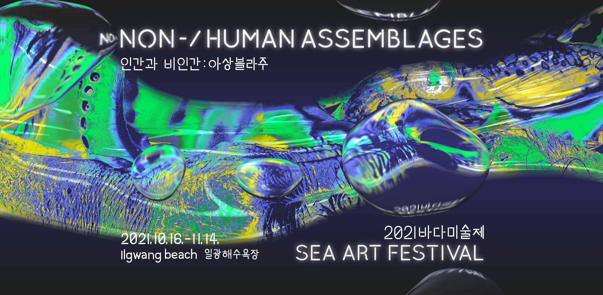 이 시대에 우리는 자신의 자아를 뛰어넘어 사고하기 위해 어떻게 우리의 의식을 확장할 수 있을까? 이러한 물음에 우리는 자스비어 푸어(Jasbir K. Puar) 에세이의 “나는 여신이 될 바에야 사이보그가 될 것이다(I Would Rather Be a Cyborg Than a Goddess)”라는 문장을 떠올리게 된다.“아상블라주는 인간의 몸에 특권을 부여하지 않고, 인간 동물/비인간 동물의 이분법 안에 존재하지도 않는다. 인간 몸의 탈-개념화와 함께, 물질의 다층적 형태들(물, 도시들, 제도들 등의 몸)이 몸이 될 수 있다. 이 발전된 이론과 네이마니스의 견해에 착안하여, 2021바다미술제의 아상블라주 개념은 우리의 모든 ‘몸들’, 즉 많은 식물과 동물의 몸들을 품고 있는 바다, 일광 해변과 기장의 주변 공간들, 전지구적 및 지역적 예술의 흐름들, 그리고 우리의 사회-정치적 공동체들을 가로질러 관계망을 만드는 물의 흐름을 통찰한다. 우리는 인간과 비-인간 사이의 단순화된 이분법을 거부하고, 잉태한 하나의 몸에 또 다른 존재가 공존하는 것처럼 서로가 조우한다.