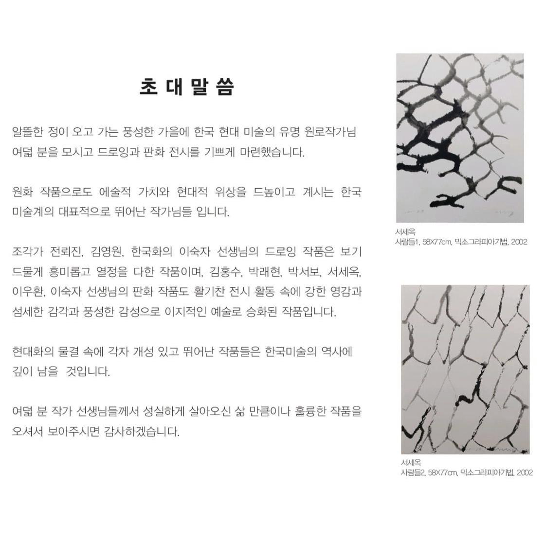 알뜰한 정이 오고 가는 풍성한 가을에 한국 현대 미술의 유명 원로작가님 여덟 분을 모시고 드로잉과 판화 전시를 기쁘게 마련했습니다. 원화 작품으로도 예술적 가치와 현대적 위상을 드높이고 계시는 한국 미술계의 대표적으로 뛰어난 작가님들 입니다. 조각가 전뢰진, 김영원, 한국화의 이숙자 선생님의 드로잉 작품은 보기 드물게 흥미롭고 열정을 다한 작품이며, 김홍수, 박래현, 박서보, 서세옥, 이우환, 이숙자 선생님의 판화 작품도 황기찬 전시 활동 속에 강한 영감과 섬세한 감각과 풍성한 감성으로 이지적인 예술로 승화된 작품입니다.