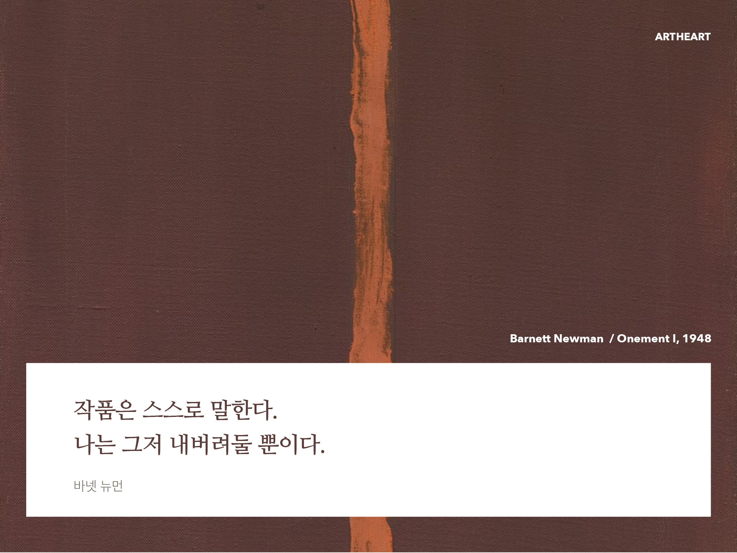바넷 뉴먼 (1905.1.29-1970.7.4) 미국 화가, 조각가, 추상표현주의 화가로 대형의 모노크롬 작품을 그린 것으로 유명하다. 뉴먼이 '지퍼'라고 이름 붙였던, 단색 캔퍼스 화면을 세로로 가로지르는 수직선이 작품의 특징이다.
