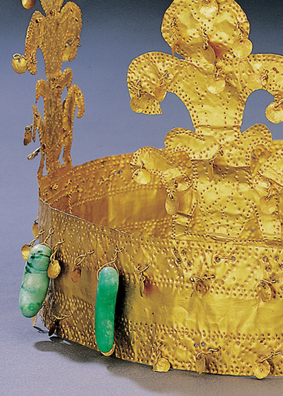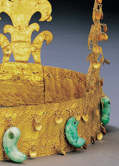 이 금관은 간결하고 단순한 형태에 화려한 장식이 어우러졌으며, 가야 문화의 신비를 상징하는 대표적인 유물이다. 현재까지 알려진 가야 금관 중에서 특히 완형의 가야 금관은 국내에서는 이 작품이 유일하다. 그 형태는 관테(臺輪) 위에 장식된 네 개의 세움장식(立飾)이 신라 금관의 출자형(出字形)과는 다른 초화형(草花形)이라는 것이 가장 큰 특징이다. 정확한 부착 위치는 알 수 없으나 이 금관에 부착된 것으로 추정되는 장식용 금구(金具)들이 상당수 전한다. 이 중 대표적인 펜촉형 부속금구에는 형태와 크기가 다른 두 종류가 있다. 큰 것은 상단 세 곳에 곡옥이 꽂혀 있고 금관과 같은 점열문과 점열격자문이 타출되어 있다. 나머지 크기가 작은 세 점은 상단이 두 갈래로 갈라지고 점열문만 타출되어 있는 점이 다르다. 단추 모양의 장식용 금구 역시 금관에 부착되었던 것으로 추정되는데, 그 형태는 원형, 행인형(杏仁形), 화형(花形)으로 정교하게 만들었다. 순금과 옥이라는 당시 최고로 귀한 재료에 세밀한 제작 기술이 접목된 한국 고대 야금 문화의 정수를 간직한 작품으로 국보로 지정되어 있다.