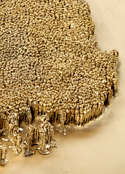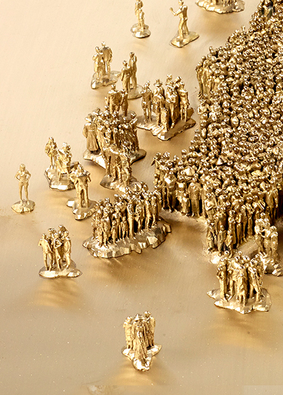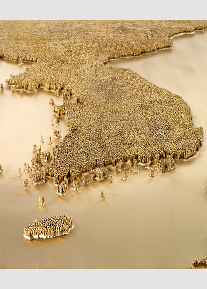 서울대학교와 예일대학교(Yale University)를 졸업한 후 국제 미술계에서 활동하고 있는 서도호는 사회에서 개인의 정체성을 묻는 명료한 주제의식과 장인(匠人)의 기교를 연상시키는 탁월한 조형감각으로 주목받는 작가 이다. <우리나라>는 우리 고유의 자연, 역사, 문화의 면면을 담고 있는 전통회화들과 다양한 금속공예품에서 영감을 받아 제작된 작품으로, 한반도라는 지리적 조건 아래 ‘우리(My/Our)’로 대변되는 한국인 특유의 집단의식과 개인의 관계에 대해 생각해보게 한다. 눈 앞에 펼쳐진 우리나라의 금빛 지형도는 1.5cm 크기의 인물상 2만 3천여 개가 군집하여 만들어진 것이다. 이 인물상들은 역사를 거슬러 다양한 시대의 남녀노소를 형상화하고 있는데, 그 개별적 차이를 알아볼 수 없을 정도로 작고 미미하다. 이는 집단 문화 속 익명화된 개인의 모습을 상징적으로 드러냄과 동시에 국가의 역사와 문화가 개인과 집단의 복잡한 상호관계 속에서 이루어졌음을 상기시킨다.