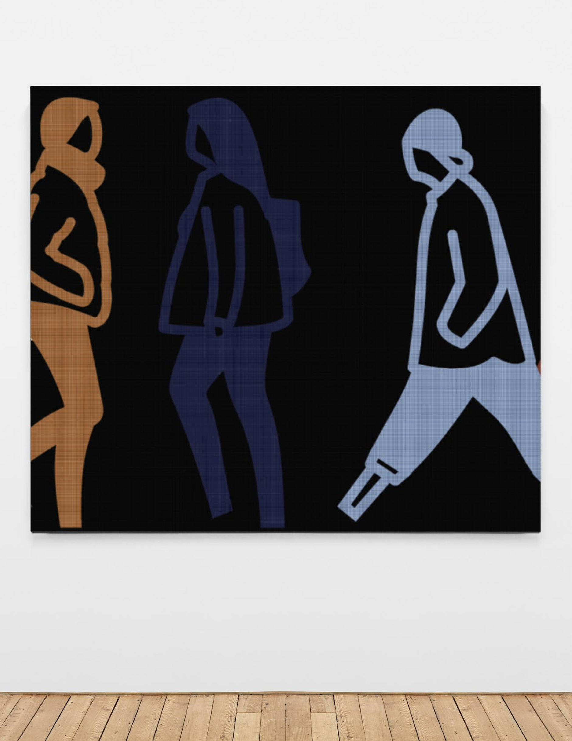 한편 K2의 1층 전시장은 도시의 사람들로 구성된다. 작가는 런던의 동쪽에 위치한 작업실 근처에서 겨울옷으로 무장한 채 길을 헤쳐 나가는 낯선 이들의 모습을 포착, 이들의 존재를 LED를 사용한 영상, 라이트 박스, 알루미늄 조각 작품으로 표현했다. 2층 전시장의 선명하고 강렬한 색감과는 반대로 해당 공간에서는 작품 속 개인의 옷, 머리카락, 그리고 피부 톤에서 따온 자연스러운 색감으로 구성된 팔레트가 펼쳐진다. 더구나 기존의 잘 알려진 원색이 아닌 톤 다운된 차분한 색감은 작품의 바탕이 되는 흰색과 검은색에 어우러져 그 계절만의 정취를 한껏 깊게 느낄 수 있도록 이끄는데, 검은 배경에서 빛이 드로잉을 투과할 때 각 선이 가진 색은 더욱 강조되고 입체성을 획득한다. 이렇듯 서로 스쳐 지나가는 순간, 행인들 각각의 크고 작은 특징을 포착하여 조합하는 작가의 예리한 관찰력은 작품 창작의 중심이 되어왔다. 오피의 작품 속 인물들은 ‘걷기’와 같은 가장 일상적인 모습 및 자세로 형상화되고, 이를 통해 인간의 평범한 행위가 예술로 거듭난다.