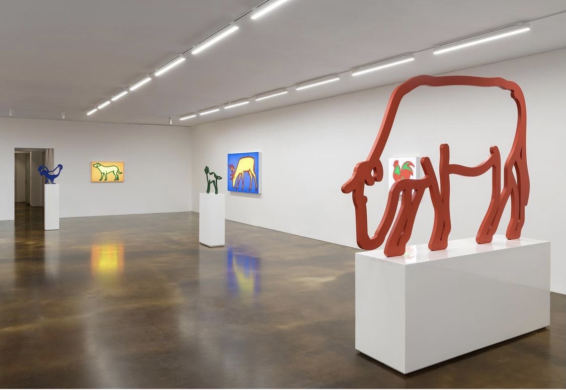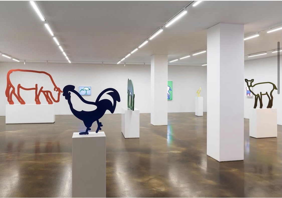이번 전시를 위해 특별히 제작된 대부분의 작품들은 각각의 공간들과 어우러져 그의 작업세계를 논리적으로 묘사하고 설득력 있게 서술한다. 그중 K2 2층 공간에는 작가가 오랜 시간 지속해온 주요 작업군 중 하나인 동물 작품이 중점적으로 전시되는데, 사람을 모티프로 한 작업만큼 다양한 크기와 형태, 색으로 구성되어 있는, 생동감 넘치는 흥미로운 작업이다. 사슴, 수탉, 소, 강아지 등 일상적으로 접할 수 있는 동물의 이미지는 작가의 조형언어 체계를 통해 친근한 대상에서 상징적 부호로 거듭나고, 여기에 산업적 환경을 연상시키는 인공적인 원색을 적용함으로써 독창성까지 담보한다. 덕분에 전시장 벽을 장식하는 밝은 라이트 박스에 새겨진 동물 소재의 회화 작품들은 현 도시를 구성하는 표지판이나 브랜드 로고 혹은 광고를 연상시키기도 하고, 좌대 위에 놓인 알루미늄 재질의 조각으로 공간 주변을 부유하며 전시장에 또 다른 물리적, 심리적 리듬감을 부여하기도 한다. 특히 인위적인 단단한 재질로 만들어진 동물 조각들은 작품의 영감인 천연한 자연과 조화와 동시에 대비를 이룬다.