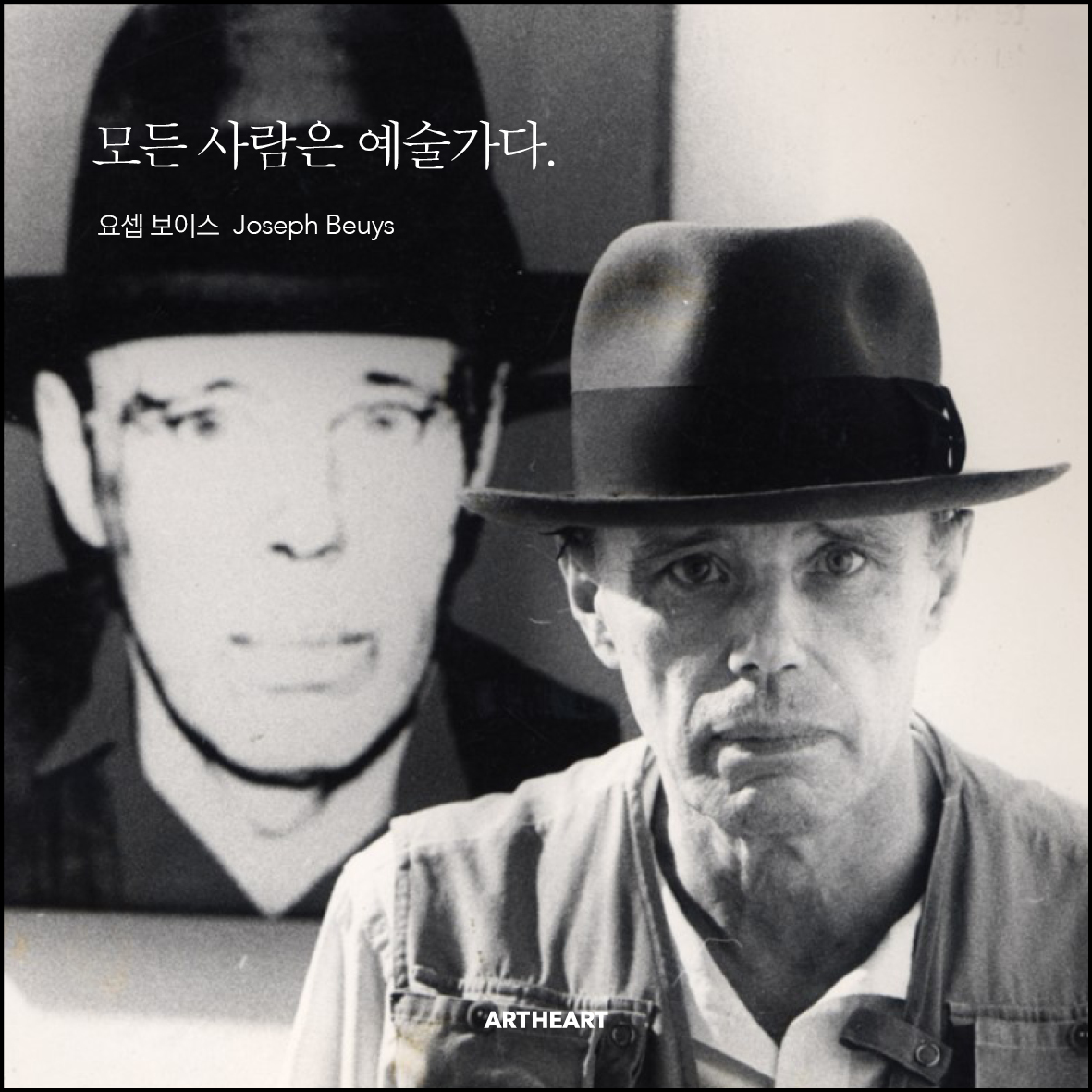 요셉보이스 (1921-1986) 독일의 행위예술가, 설치예술가. 플럭서스 일원으로 활발한 활동을 했으며, 펠트와 기름덩어리를 모티브로 퍼포먼스 작품을 선보였다. 미술은 "낡은 사회 구조의 억압적인 면을 제거할 수 있는 진화적이고 혁신적인 유일한 힘"이라고 주장했다.