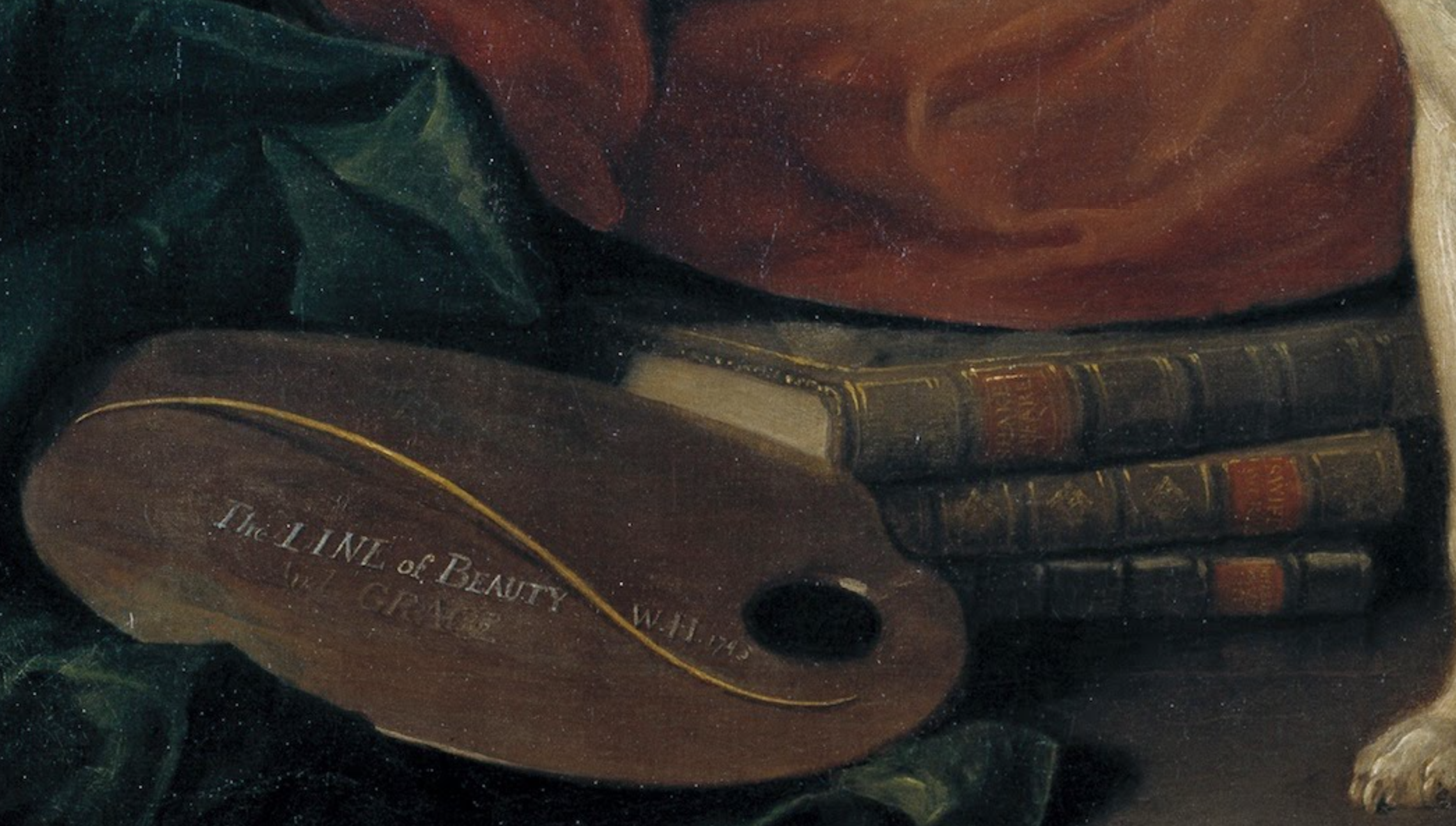 작가 윌리엄 호가스는 이 자화상을 1730년대 중에 처음 시작했다. 그림이 완성된 시기는 1745년으로 약 10 년 기간 동안 완성된 작품이다. 엑스레이에 따르면 지금 그려진 의상과 다른 코트와 가발을 착용한 작가의 모습이 보였다. 작가는 처음에는 정장을 입은 모습을 그리려고 했으나 페인팅 과정에서 비격식적인 의상과 헤어스타일로 변경해 그렸다. 호가스의 자화상을 담고 있는 타원형의 캔버스는 셰익스피어, 스위프트, 밀턴의 작품들 위에 세워져 있다. 이들은 호가스의 드라마, 풍자, 서사시에 대한 헌신에 영감을 준 작가들이다. 그의 팔레트 표면 위에 맴도는 것은 '미와 은총의 선'인데, 이것은 예술에 대한 호가스 자신의 이론을 뒷받침했다. 이목구비가 자신과 닮은 호가스의 퍼그 개 트럼프는 예술가 자신의 퍼그너티브 캐릭터의 상징 역할을 한다.