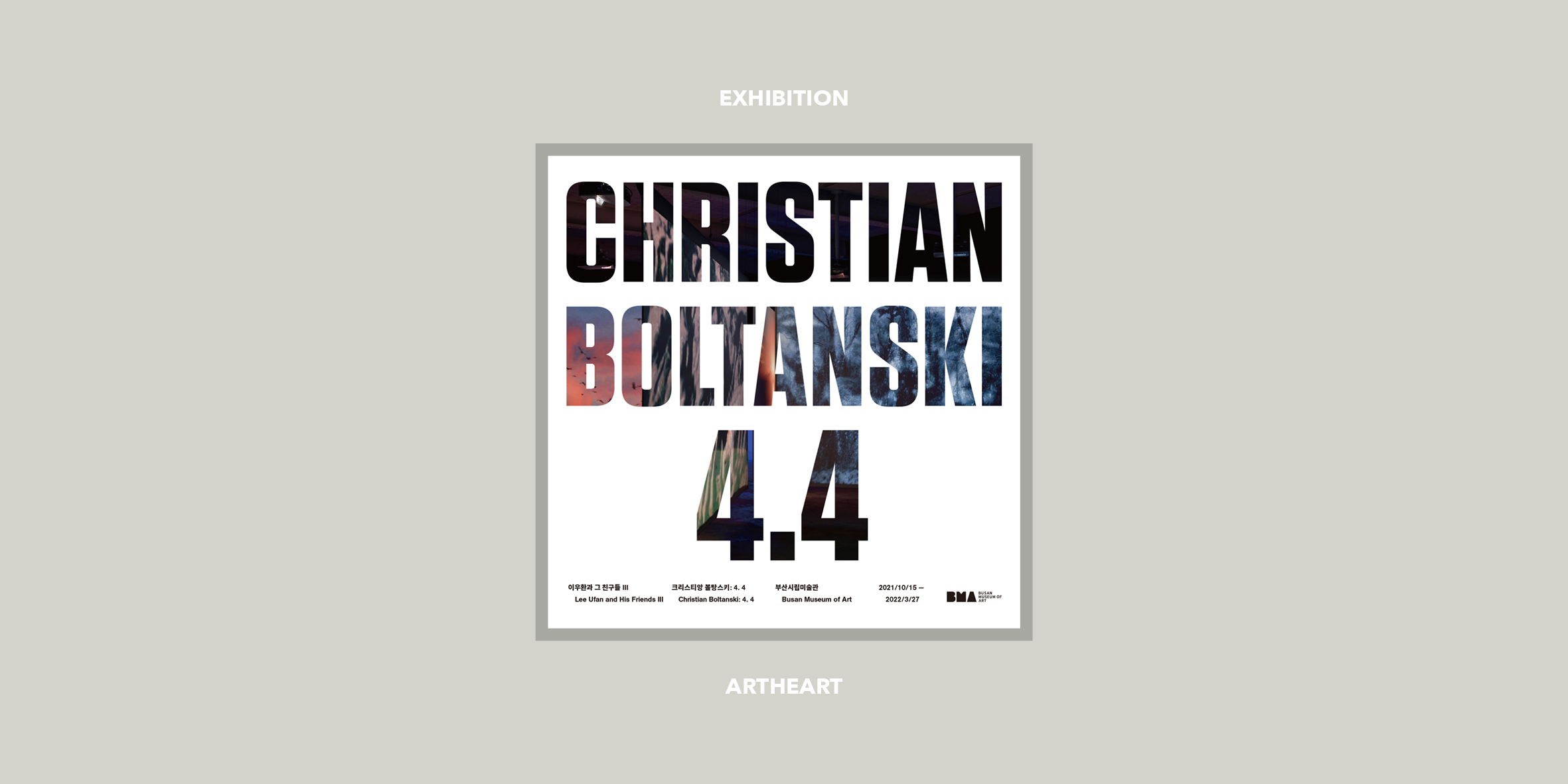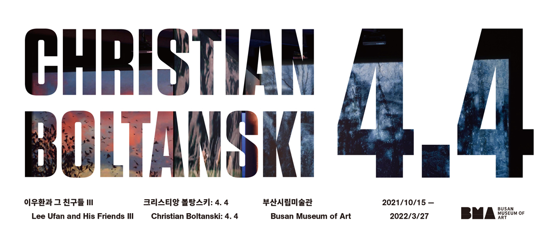 부산시립미술관은 이우환과 그 친구들 시리즈 세 번째 전시로 《 크리스티앙 볼탕스키 : 4.4 》전을 개최한다. 1997년 국립현대미술관 개인전 이후 진행하는 작가의 국내 최대 회고전이자 작가의 첫 유고전이다. 전시 제목 “4.4”는 그가 태어난 해 1944년을 의미한다. 그리고 한국에서 숫자 4가 “死(죽을 사)” 와 발음이 같아 죽음을 상징하는 숫자라는 것이 흥미롭다고 작가는 말했다. 작가는 전시 기간 중 어렴풋이 자신의 삶의 여정이 얼마 남지 않았다는 것을 알고 있었고 작가에게 지금의 시간은 인생을 4단계(생로병사, 生老病死)로 나눌 때 ‘마지막 생의 단계’라는 의미를 가지고 있어 작가가 직접 선택한 타이틀이다. 또한, 4라는 숫자 다음에 표기된 마침표는 그의 인생의 마지막을 상징하는 기표이기도 하다.
