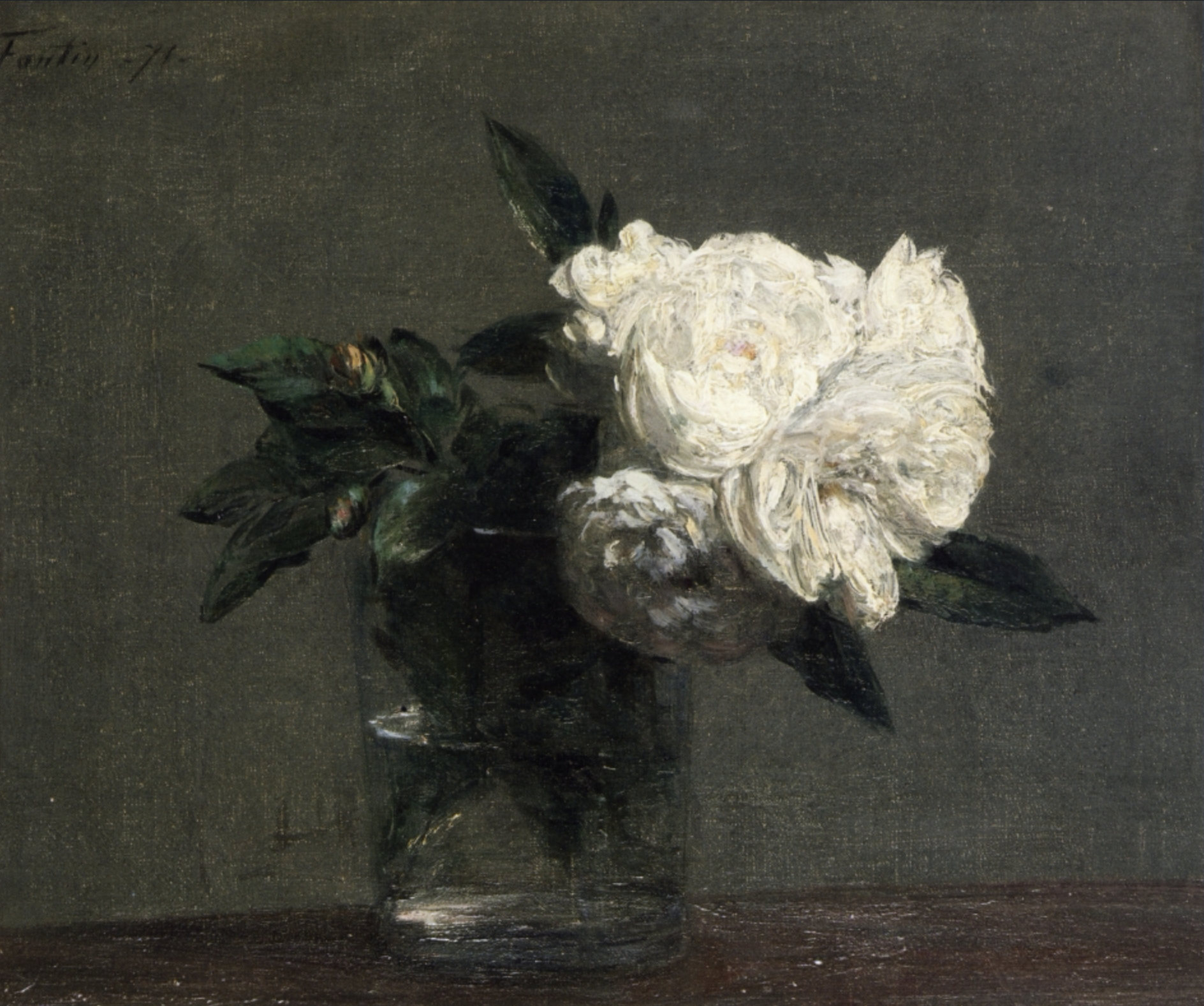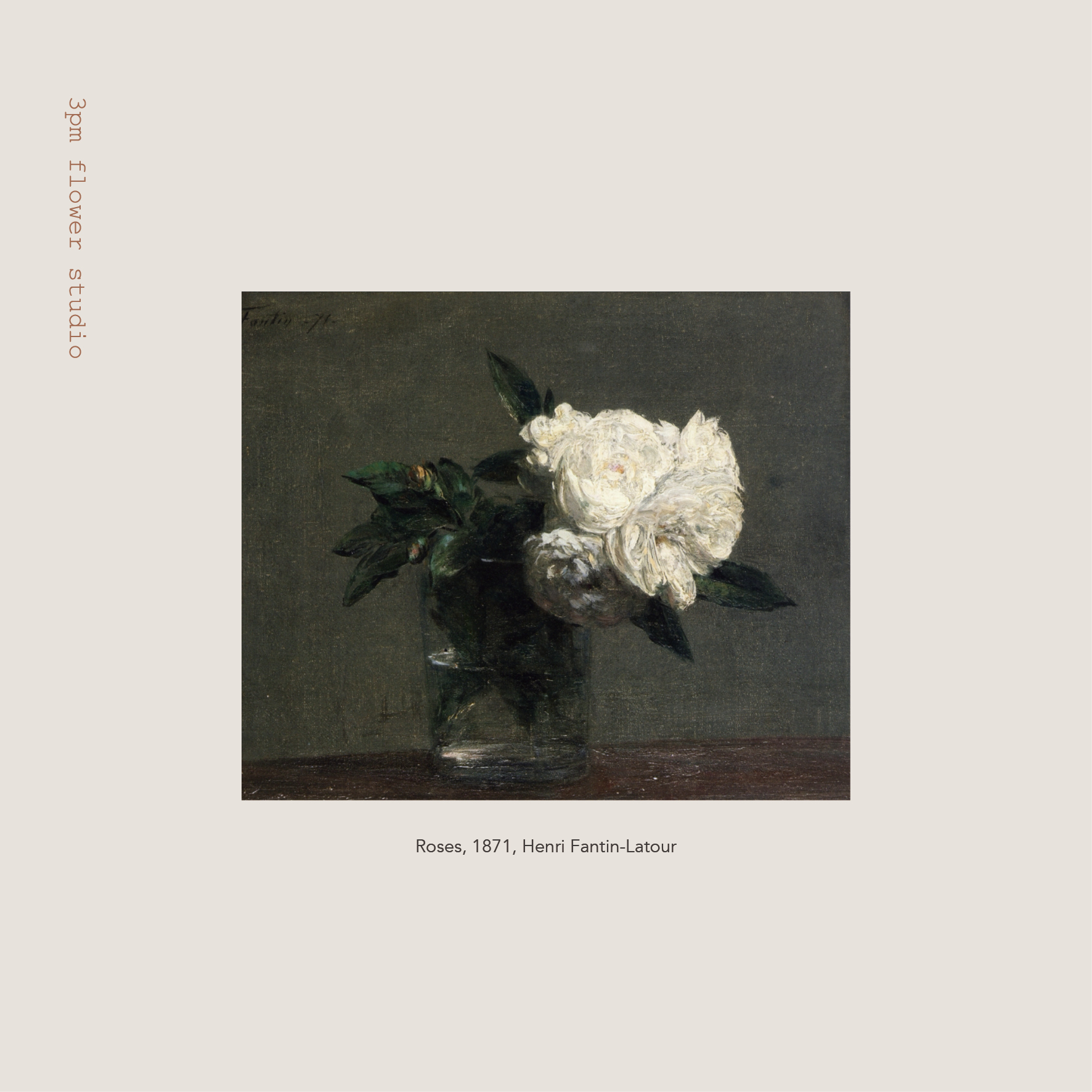 오늘 소개 할 그림은 유리컵에 담긴 흰색 장미입니다. 짙은 회색 바탕에 흰색 장미의 컬러 조화가 차분한 느낌을 줍니다. 이 작품을 그린 작가는 앙리 팡탱 라투르 프랑스 화가입니다. 화가이자 미술 교사인 아버지로 부터 미술의 기초를 배웠습니다. 사실주의 화가인 귀스타브 쿠르베의 제자였고, 마네의 작품을 접하고 인상주의 화가 에두아르 마네와 함께 생활하였습니다. 또한, 낭만주의 화가 외젠 들라크루아의 영향을 받았습니다. 사실주의, 인상주의 사이를 오가며 자신만의 양식을 만들었습니다. 꽃 정물화로 인정을 받았으며, 대표작으로는 베티놀스의 작업실, 1870 / 들라크루아 예찬, 1864가 있습니다.