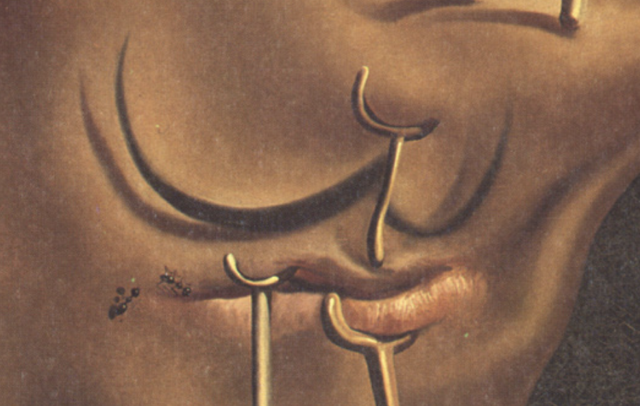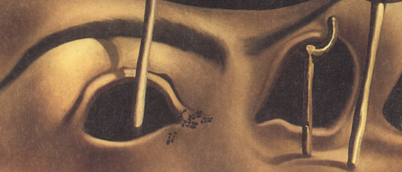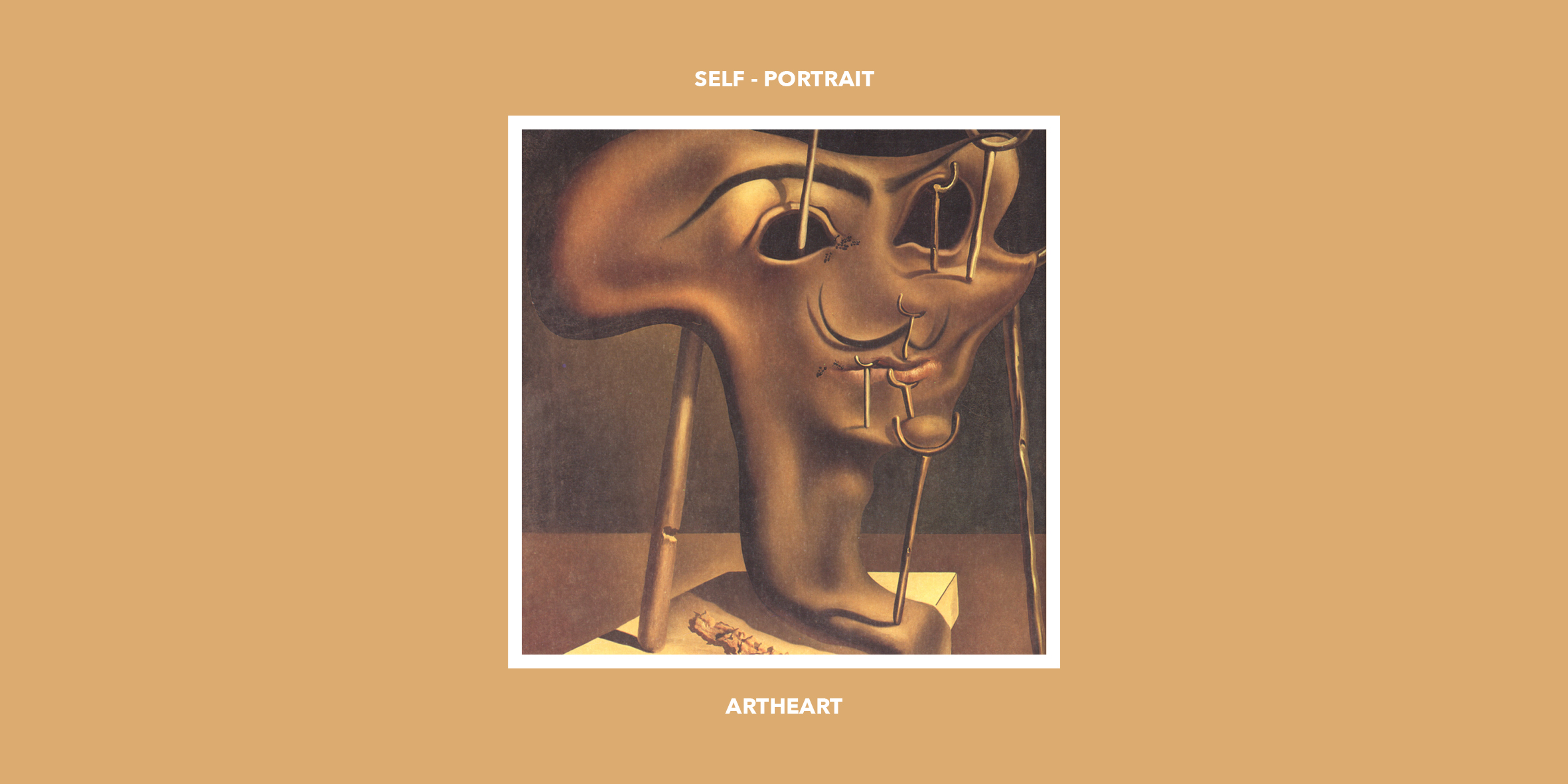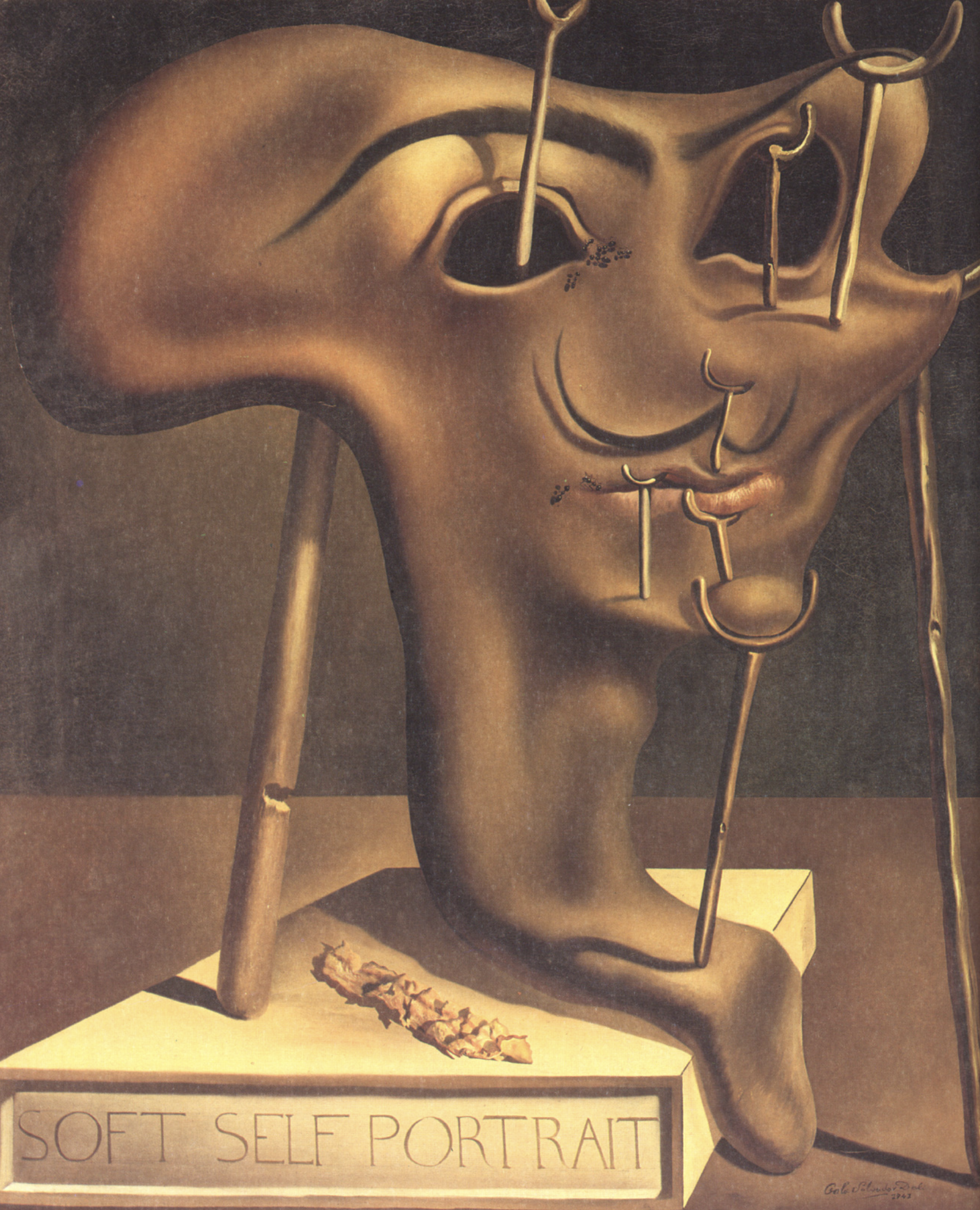 보통 자신의 천재성을 주제로 고민할 때 달리는 여기서 온화한 자기 조롱의 정신으로 공공의 이미지를 희화화했다. 그의 정체는 주로 그의 등장을 즉각적으로 기억에 남도록 만든 뒤집힌 안테나 같은 콧수염을 통해 전달된다. 그의 작품에서 목발은 훨씬 더 친숙한 존재이며, 달리 자신은 대중이 목발에 싫증을 느끼는 대신, 목발을 곱할수록 점점 더 열광하는 것 같다고 언급했다. 동그란 눈과 입은 또한 부패하거나 허약함을 나타낸다.