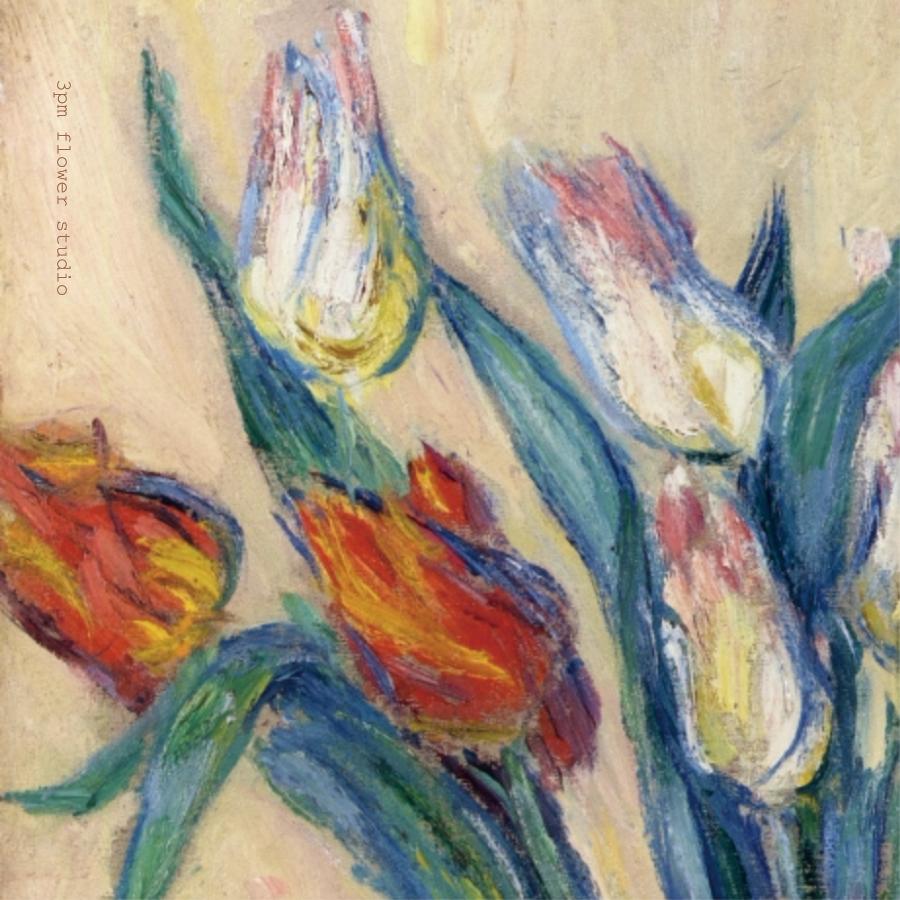 튤립은 네덜란드의 상징적인 꽃이지만, 원산지는 터키입니다. 17세기 튤립 대유행에 투기의 대상이 되었던 튤립. 200년 후에 그려진 튤립은 그저 아름답기만 합니다. 이 작품은 그림 정중앙에 놓여 있는 꽃병을 관람자의 시선의 일직선으로 정면으로 바라보고 있는 듯한 느낌을 줍니다. 중앙에 배치된 9개의 튤립을 주변으로 상, 좌우 여백이 동일하게 남아 있어 안정감을 줍니다. 생명력이 느껴지는 거친 붓터치와 붉은색과 흰색, 짙은 초록, 바탕의 베이지 색톤이 조화롭습니다.
