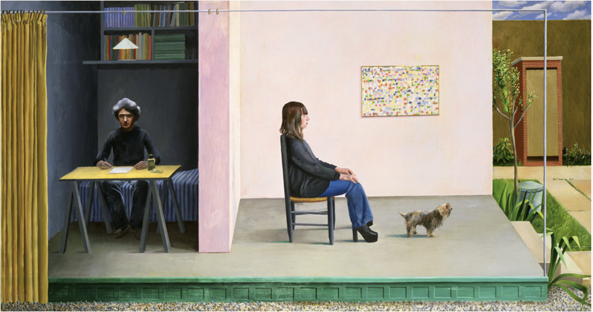 공간이 흥미롭다. 집의 내부를 그린 것인지 가상의 공간인지 알 수 없다. 공간은 세 군데로 나누어진다. 중심에 자리 잡고 있는 여성은 의자에 앉은 옆모습이다. 강아지도 같은 방향으로 우리에게는 옆모습을 보여준다. 핑크색톤의 벽과 벽면에는 컬러풀한 그림액자가 걸려있다. 왼쪽 구석에는 노란색 커튼이 모아져 있다. 책상에 앉아 펜을 쥐고 있는 남성의 모습은 어두운 톤의 벽면과 옷, 그늘진 얼굴로 무겁고 어두운 분위기를 자아내 오른쪽 핑크색 부분과 상반된 느낌을 준다. 오른쪽 부분은 집의 내부가 아닌 밖, 정원 풀과 계단이 보인다.