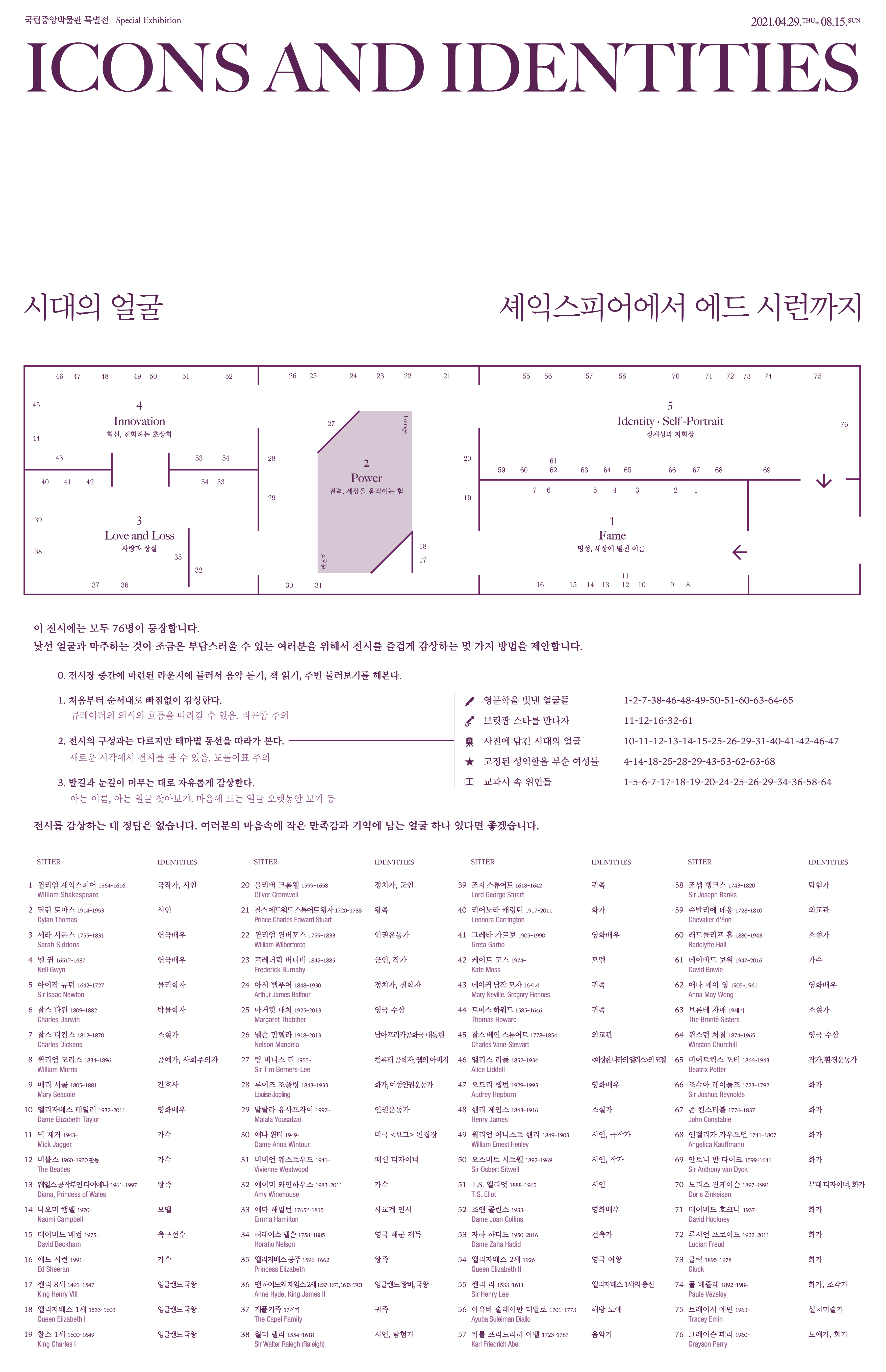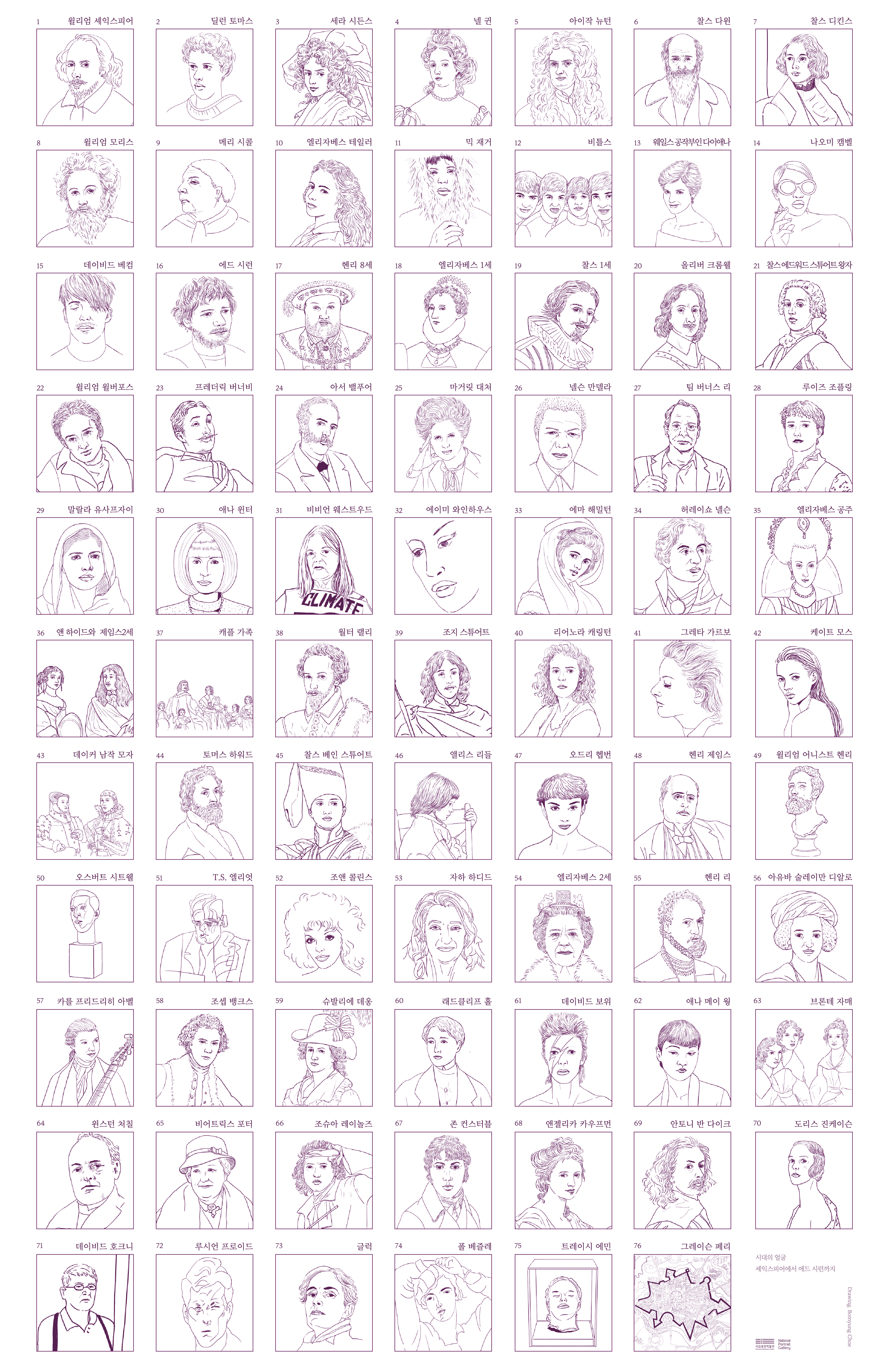 우리는‘76명의 삶’과 그들을 그린 ‘초상화’라는 예술 장르에 대해서 이야기하려 합니다. 초상화를 본다는 것은 ‘그림 속 인물을 바라보는’ 시각적인 경험인 동시에‘그림 속 인물과 만나는’ 심리적인 경험이기도 합니다. 초상화는 낯설지만 공감하기 쉬우며 단순하지만 복잡한 의미를 가진 그림입니다. 바로 우리, 인간의 모습을 닮았기 때문이죠. 이번 전시는 영국 국립초상화미술관이 간직해 온 세계적인 컬렉션을 처음으로 소개하는 전시로 500여 년의 시간을 넘나들며 세계 역사와 문화를 빛낸 인물들의 초상화를 한 자리에서 볼 수 있는 흔치 않은 기회입니다. 전시를 구성하는 다섯 개의 주제, ‘명성’, ‘권력’, ‘사랑과 상실’, ‘혁신’, ‘정체성과 자화상’은 초상화가 가진 다양한 의미를 자세히 살펴볼 수 있도록 이끌어 줄 것입니다. 무엇보다 이번 전시를 보는 즐거움은 셰익스피어, 엘리자베스 1세, 아이작 뉴턴, 비틀스, 에드 시런에 이르기까지 영국과 세계의 역사를 빛낸 인물들을 만나고 대화를 나눌 수 있다는 데에 있을 것입니다. 전시를 보는 동안 그림 속 인물과 눈을 맞추고 그의 인생을 떠올려 보세요. 그리고 그 사람의 눈빛과 표정을 담아 가실 수 있다면 좋겠습니다.