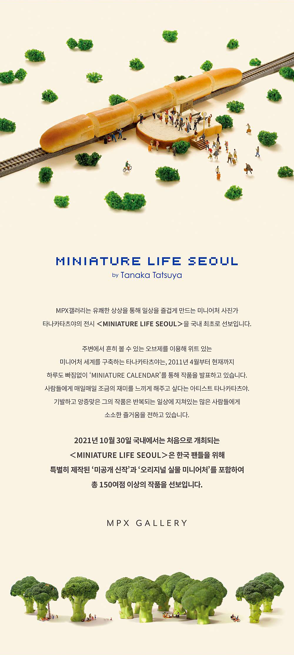 330만 팔로워를 보유한 글로벌 아티스트, 타나카타츠야의 국내 최초 전시가 MPX갤러리에서 개최한다. 타나카타츠야는 유쾌한 상상을 통해 일상을 즐겁게 만드는 미니어처 사진가로 주변에서 흔히 볼 수 있는 오브제를 이용해 위트 있는 미니어처 세계를 구축했다. 2011년 4월부터 현재까지 하루도 빠짐없이 'MINIATURE CALENDAR'를 통해 작품을 발표하고 있다. 사람들에게 매일매일 조금의 재미를 느끼게 해주고 싶다는 아티스트 타나카타츠야. 기발하고 앙증맞은 그의 작품은 반복되는 일상에 지쳐있는 많은 사람들에게 소소한 즐거움을 선사한다. 전시는 #Workers, #Adventure, #Sports 등 9가지 테마를 10개의 공간으로 구성하며 한국 팬들을 위해 특별히 제작된 '미공개 신작'과 '오리지널 실물 미니어처'를 포함한 총 150 여 점 이상의 작품을 선보인다. 전시는 10월 30일부터 내년 1월 9일까지.