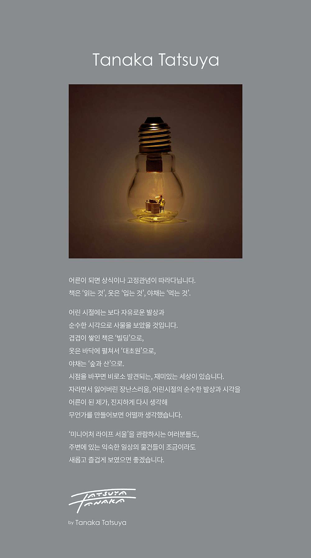 '미니어처 라이프 서울'을 관람하는 여러분들도, 주변에 있는 익숙한 일상의 물건들이 조금이라도 새롭고 즐겁게 보였으면 좋겠습니다. / Tanaka Tatsuya