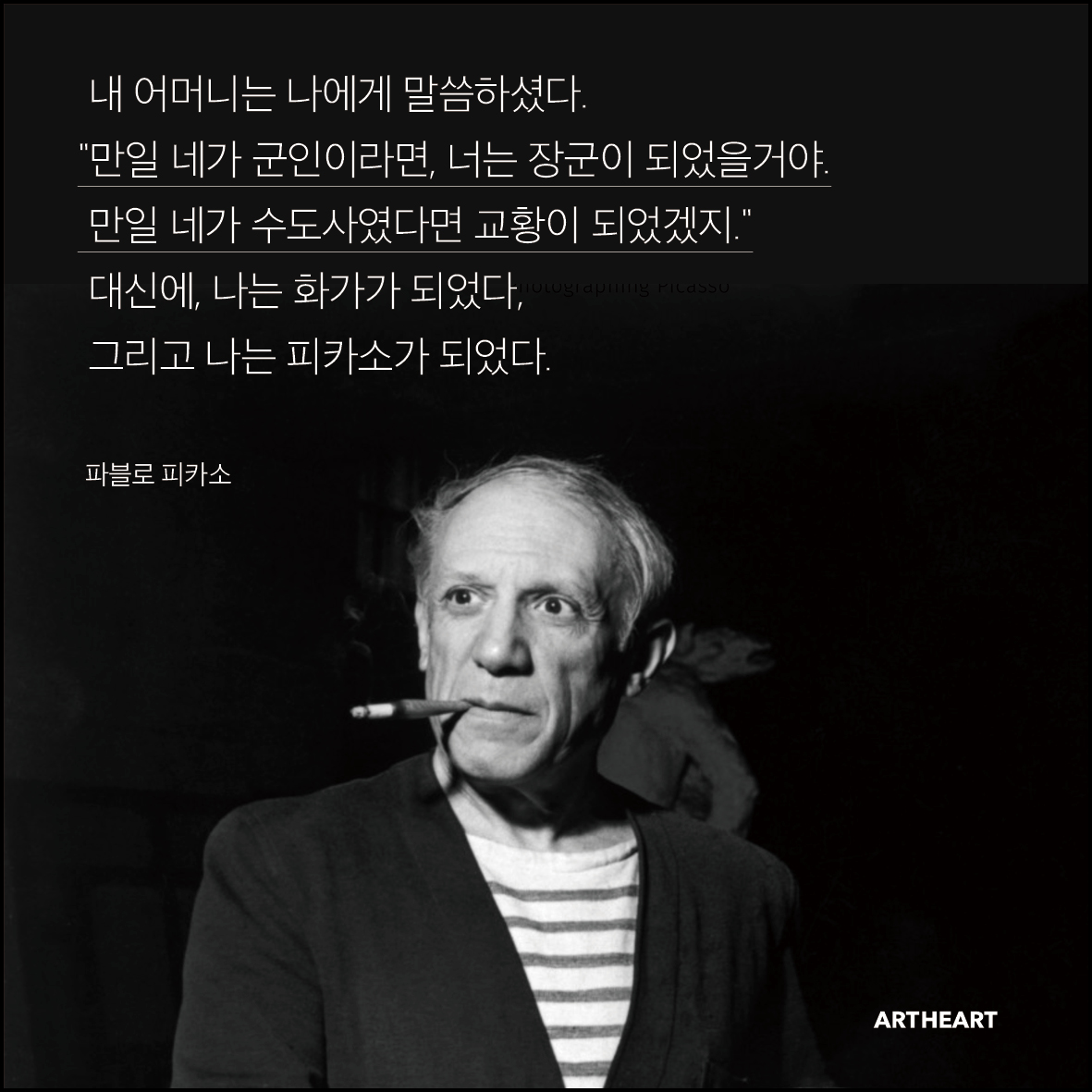 내 어머니는 나에게 말씀하셨다. "만일 네가 군인이라면, 너는 장군이 되었을거야. 만일 네가 수도사였다면 교황이 되었겠지." 대신에, 나는 화가가 되었다, 그리고 나는 피카소가 되었다."