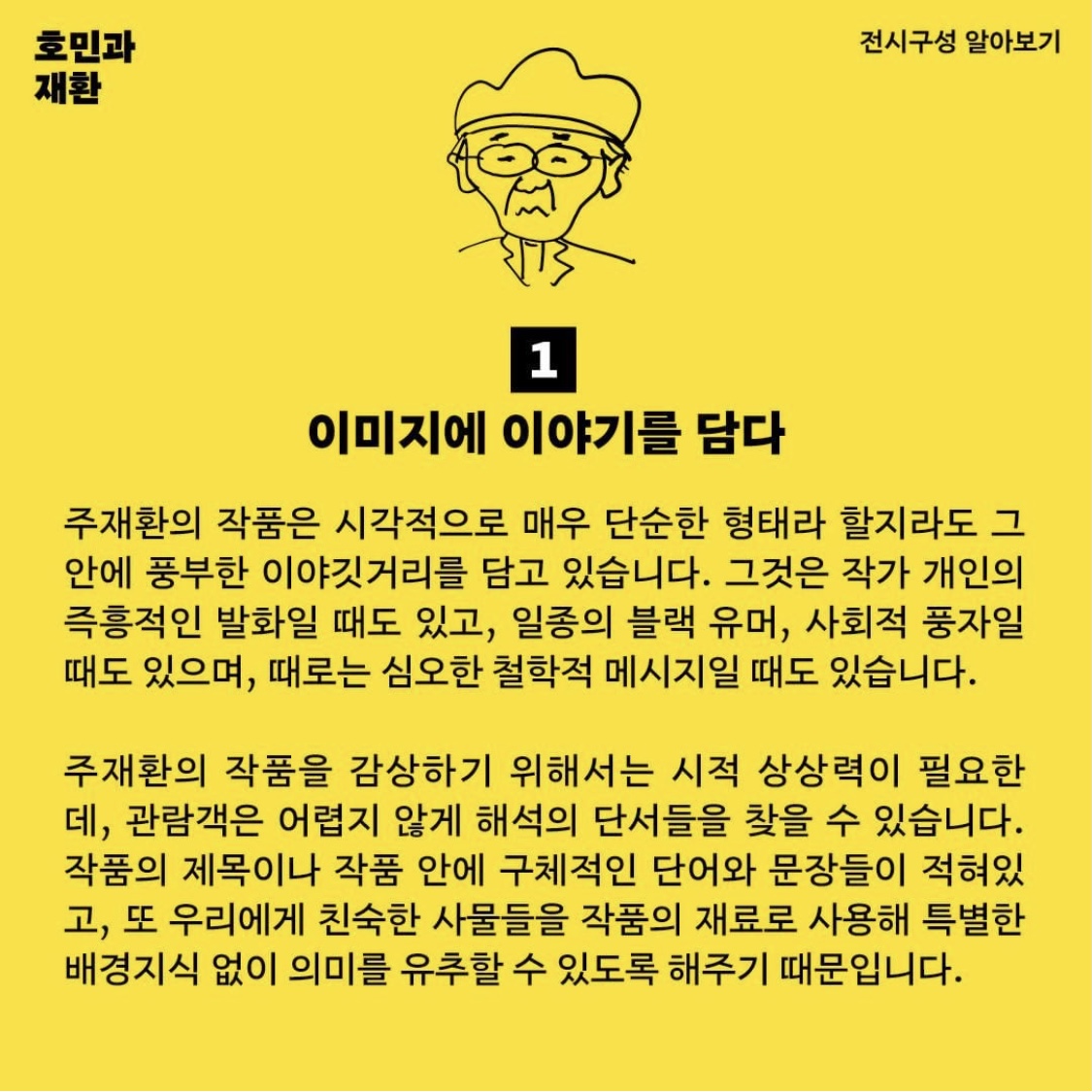 《호민과 재환》은 한국 현대사의 주요 이슈들을 유머러스하면서도 날카로운 시선으로 조망해 온 작가 주재환과, 한국 신화를 기반으로 삶과 죽음의 경계를 해석한 웹툰으로 널리 알려진 작가 주호민 부자의 2인전이다. 이번 전시는 서로 다른 영역에서 활동 중인 두 작가의 작품세계가 교차하는 방식을 통해 이들이 공유하는 타고난 ‘이야기꾼’, 즉 ‘스토리텔러’로서의 면모가 세대를 거쳐 어떻게 진화하고 다르게 발현되는지를 살펴본다.