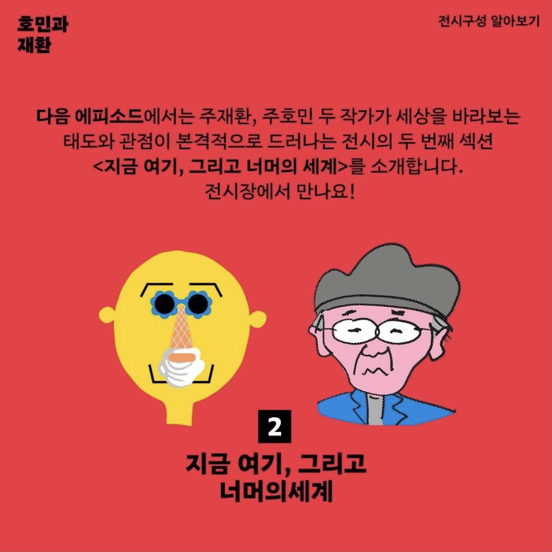 《호민과 재환》은 아버지와 아들, 미술과 웹툰 이라는 각기 다른 입장과 장르에 속한 화자들이 미술관이라는 한 공간에서 작품을 통해 이야기를 나누는 과정이며, 이를 통해 관객은 전혀 새로운 관점에서 두 작가를 바라보고 이들 주변과의 관계성까지 이해할 수 있다. 이번 전시가 두 부자의 이야기를 넘어서, 작가와 관람객 그리고 관람객과 관람객이 나누는 또 다른 이야기로 확장되길 바란다. / SeMA