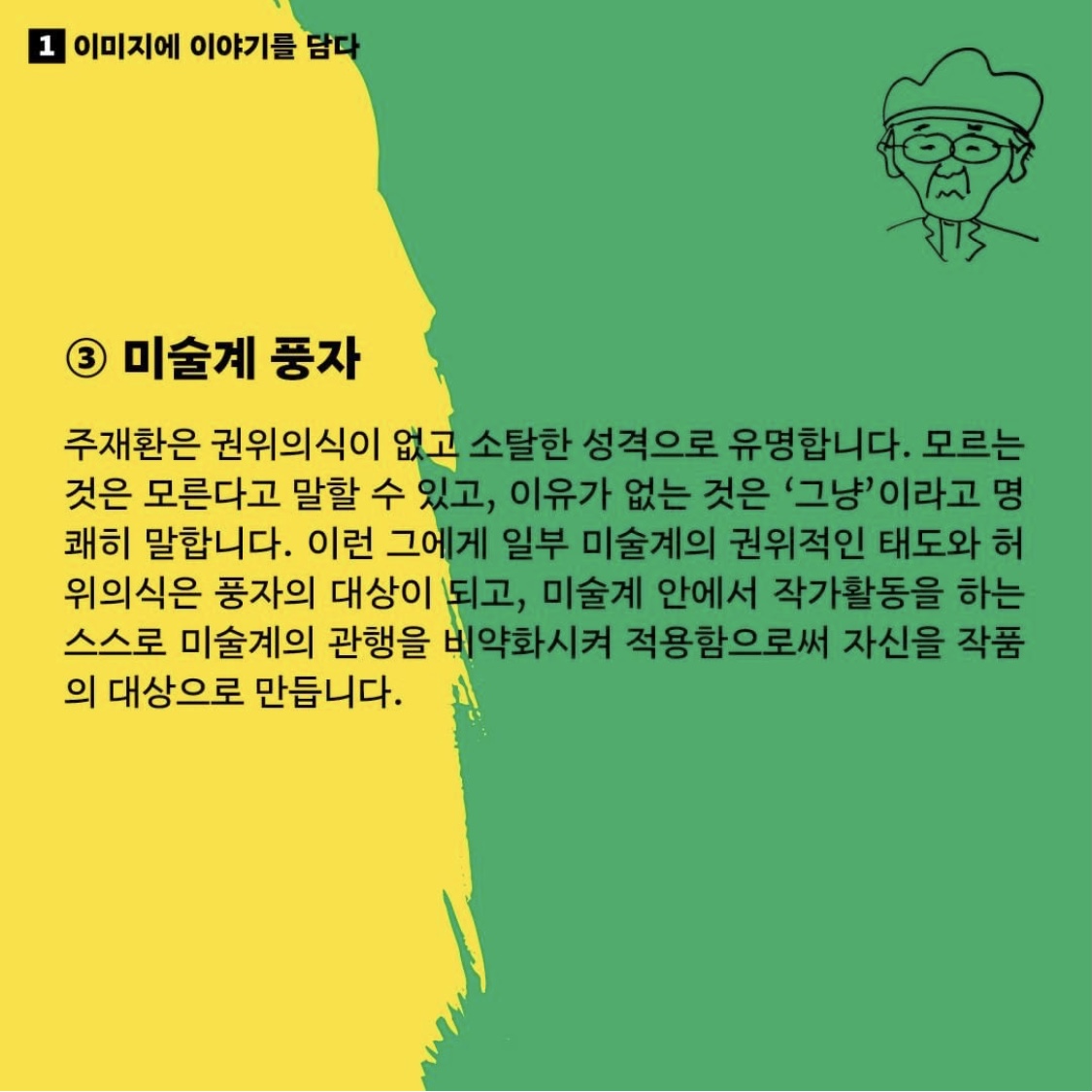 주재환의 작품은 시각적으로 매우 단순한 형태라 할지라도 그 안에 풍부한 이야깃거리를 담고 있습니다. 그것은 작가 개인의 즉흥적인 발화일 때도 있고, 일종의 블랙 유머, 사회적 풍자일때도 있으며, 때로는 심오한 철학적 메시지일 때도 있습니다.
