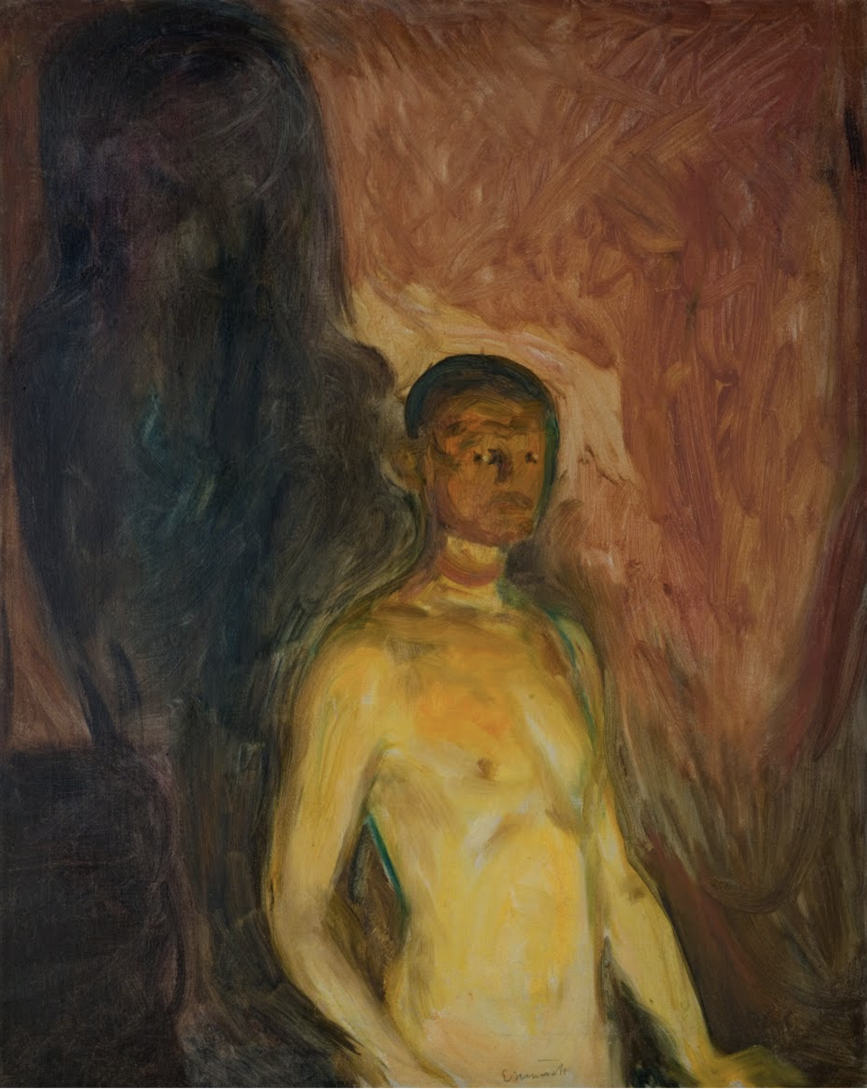 1903년 에드바르 뭉크가 그의 여름 별장 정원에서 알몸으로 서 있는 자화상입니다. 지옥에서의 자화상은 뭉크가 그 당시 어떻게 인간과 예술가로서의 위치를 인식했는지 명확하게 보여줍니다.