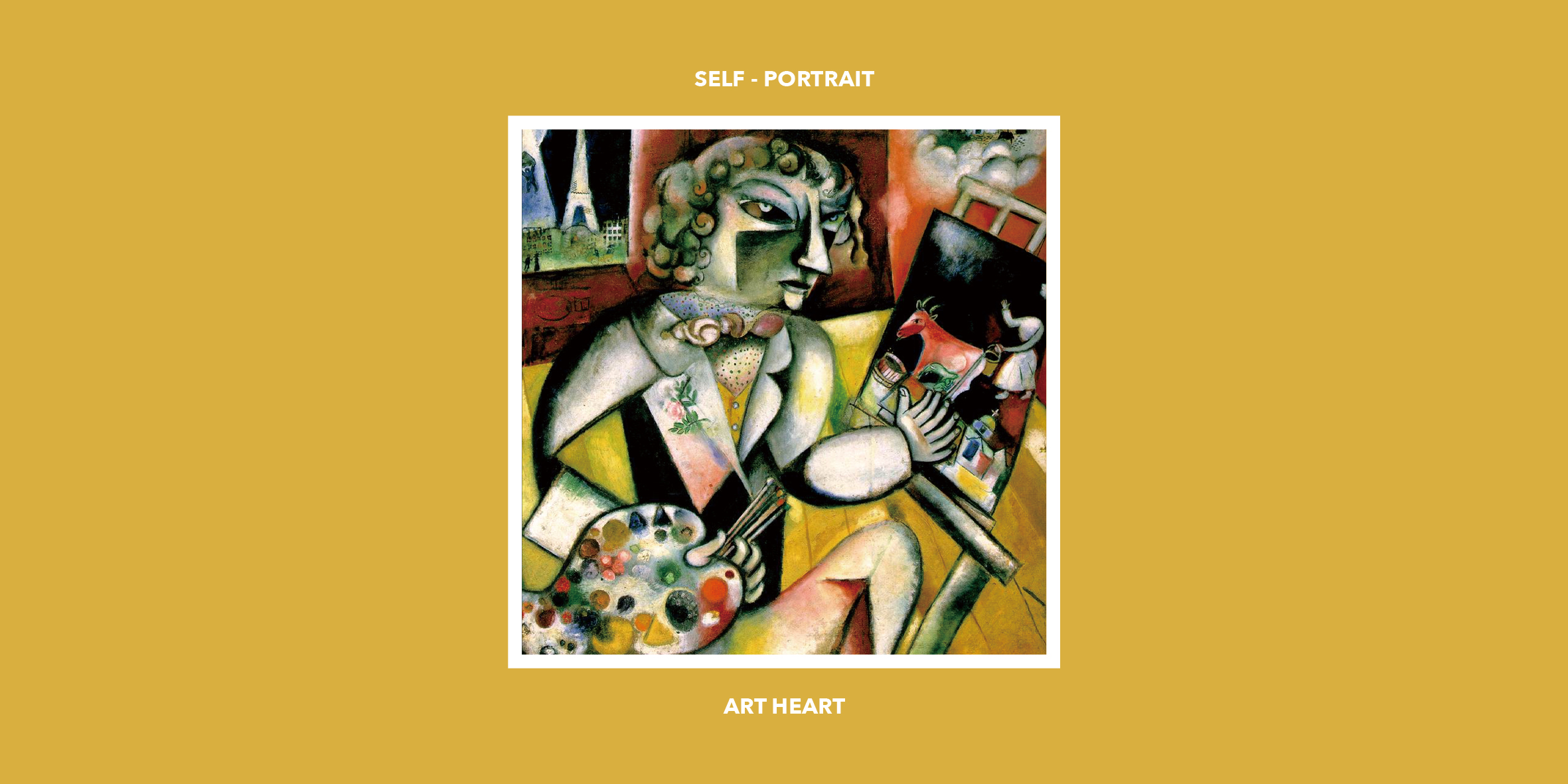 마르크 샤갈은 러시아 비테프스크 출신으로 프랑스에서 활동한 예술가이다. 손가락이 일곱 개인 자화상은 샤갈이 처음 파리에 머문 시절 그린 자화상으로 그의 나이는 26살이었다. 그림 곳곳에 고향에 대한 향수를 느낄 수 있다. 왼쪽 창가에는 현재 자신이 있는 파리를 상징하는 에펠탑이 보인다. 오른쪽 상단에는 고향 마을인 비테프스크의 풍경이 구름에 둘러싸여 있다. 입체파에서 주로 쓰는 각진기법을 화가의 얼굴과 팔라인에서 표현했다. 뚜렷한 이목구비, 커다란 눈에서 그림에 대한 열정이 엿보이며, 이젤 위 그림은 샤갈 자신의 최고의 걸작으로 꼽은 <러시아에게, 당나귀에게, 그리고 타인들에게>가 그려져 있다. 다양한 색깔의 물감을 짜놓은 팔레트를 든 오른손, 캔버스를 가리키고 있는 왼손 손가락 개수는 일곱 개다. 상단에는 빨간색과 하단에는 노란색을 위주로 그림의 외곽을 검은색으로 진하게 표현했다. 샤갈의 과거, 현재의 감정이 담긴 자화상으로 그림 속 상단 화가의 머리 위에 히브리어로 '파리'와 '러시아'라고 쓰여있다.