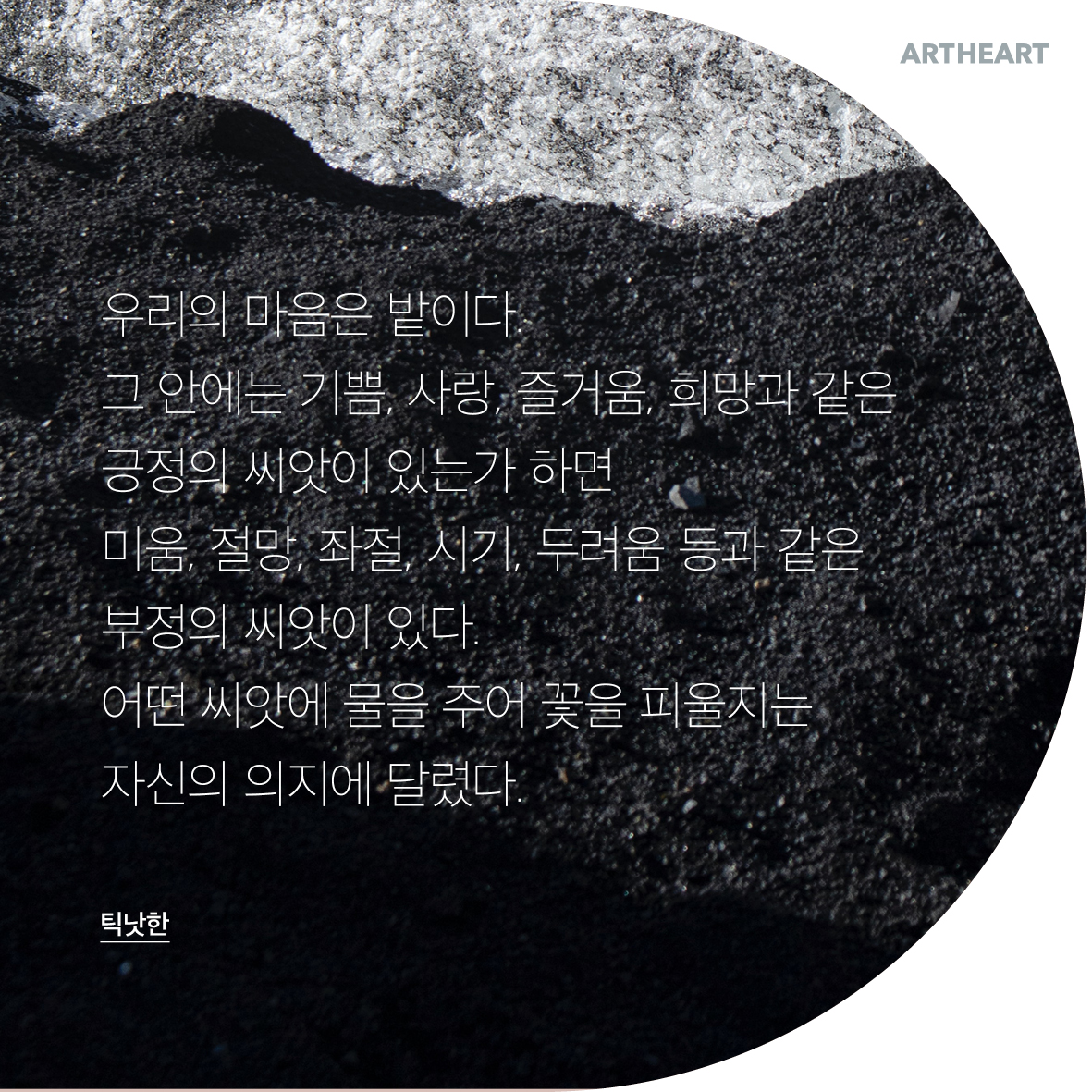 우리의 마음은 밭이다. 그안에는 기쁨, 사랑, 즐거움, 희망과 같은 긍정의 씨앗이 있는가 하면 미움, 절망, 좌절, 시기, 두려움 등과 같은 부정의 씨앗이 있다. 어떤 씨앗에 물을 주어 꽃을 피울지는 자신의 의지에 달렸다. / 틱낫한