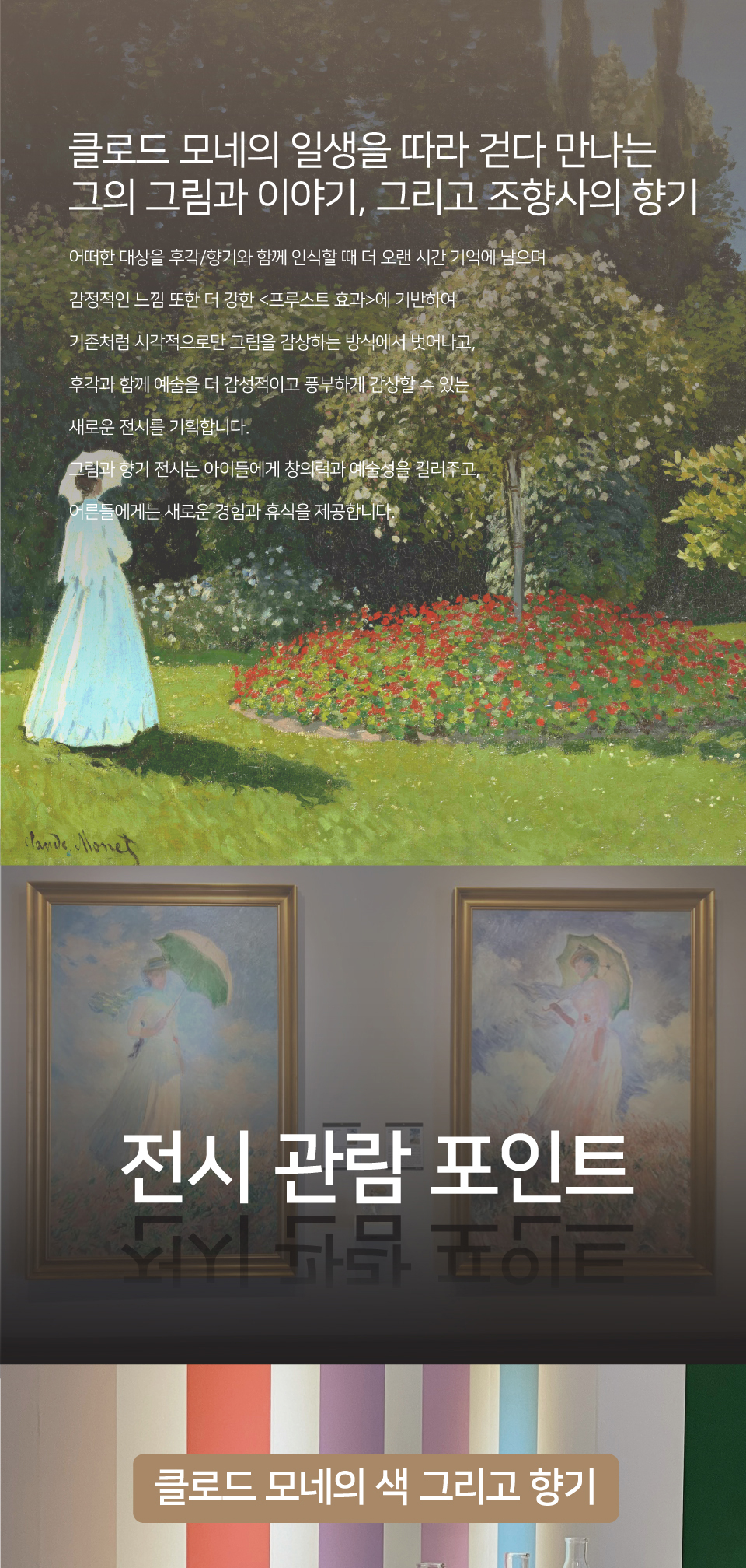 영원한 빛의 화가, 클로드-오스카 모네의 이야기와 교육 및 체험을 위해 특수한 방식으로 원작을 재현한 레플리카 작품을 조향사가 그림으로부터 영감 받아 조향한 향수와 함께 감상하는 전시로 한 권의 책처럼 화가의 이야기와 그림을 눈으로 보고, 향기로 기억하는 색다른 경험과 휴식을 위해 기획되었습니다. / 헤이리스