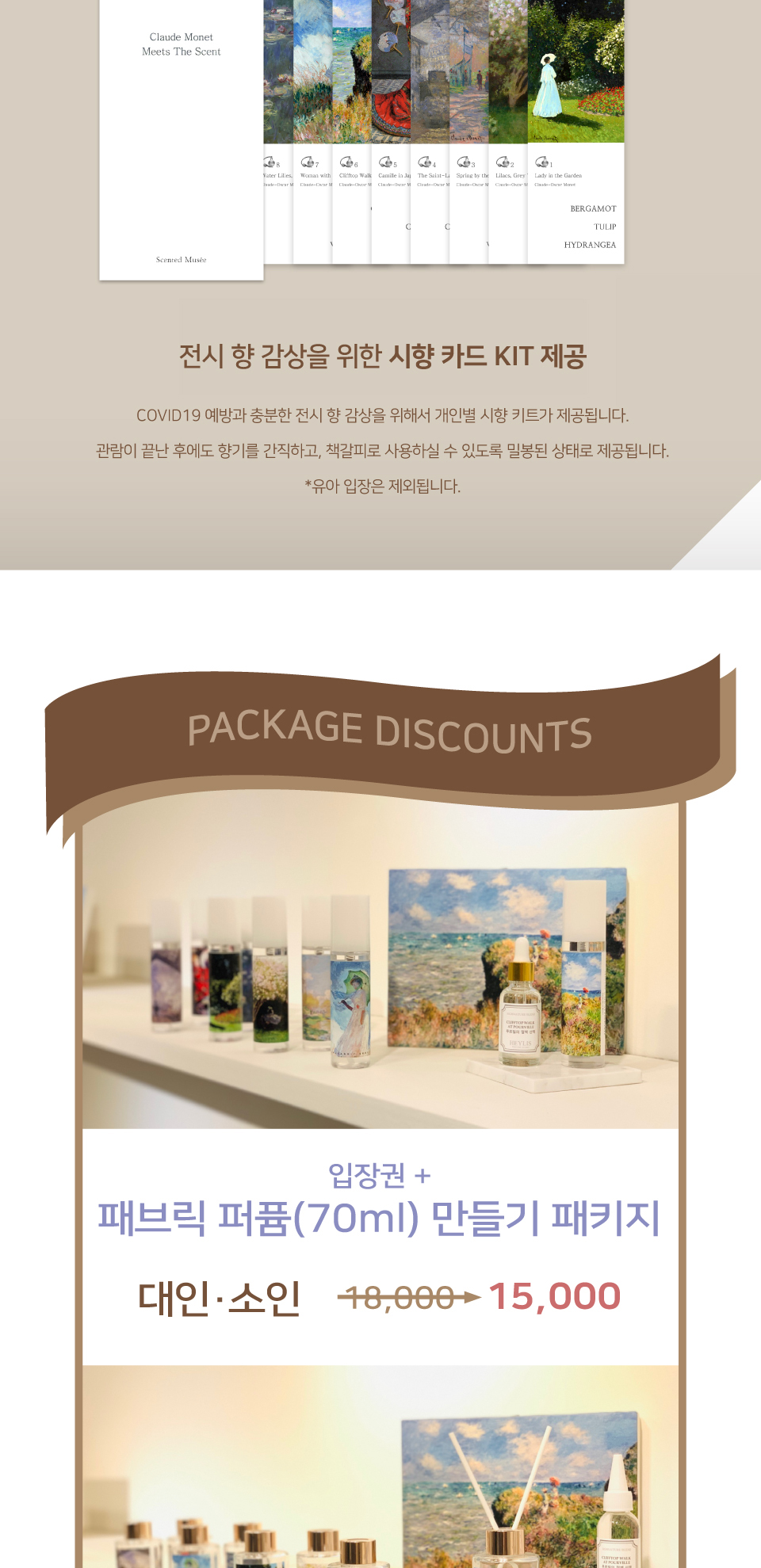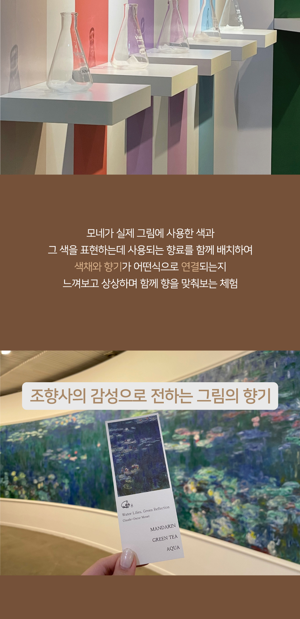 전시 향 감상을 위한 총 8장의 시향 키트를 제공하여 모네의 색을 향으로 느낄 수 있다. (시향지는 관람 후 책갈피로 사용할 수 있음)