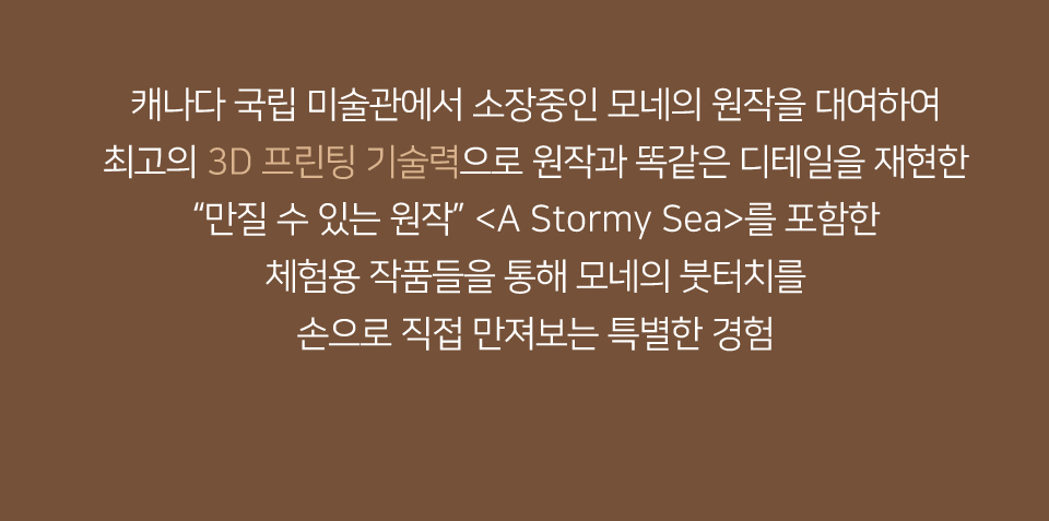 캐나다 국립 미술관에서 소장 중인 모네의 원작을 대여하여 최고의 3D 프린팅 기술력으로 원작과 똑같은 디테일을 재현한 "만질 수 있는 원작" <A Stormy Sea>를 포함한 체험용 작품들을 통해 모네의 붓터치를 손으로 직접 만져보는 특별한 경험