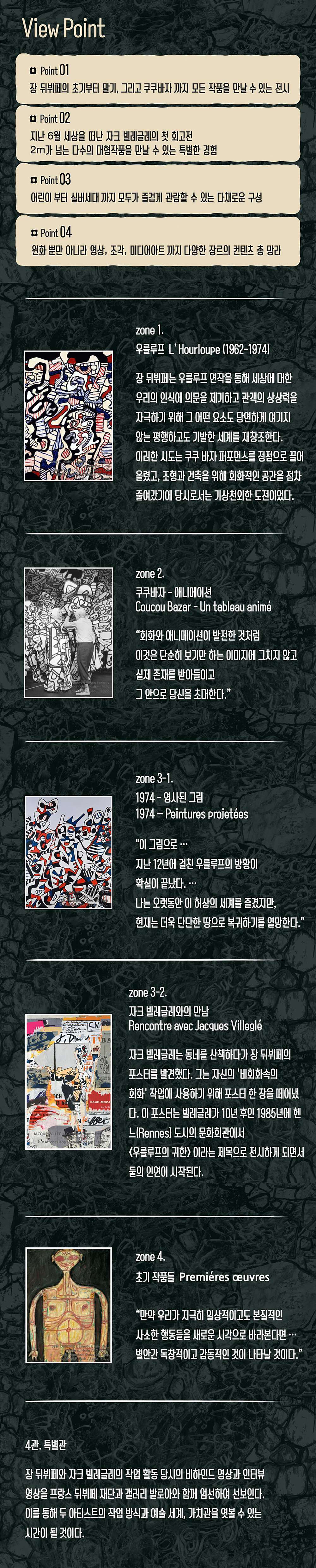 장 뒤뷔페의 초기부터 말기, 그리고 쿠쿠바자까지 모든 작품을 만날 수 있는 전시 지난 6월 세상을 떠난 자크 빌레글레의 첫 회고전원화뿐만 아니라 영상, 조각, 미디어아트까지 다양한 장르의 컨텐츠 총망라