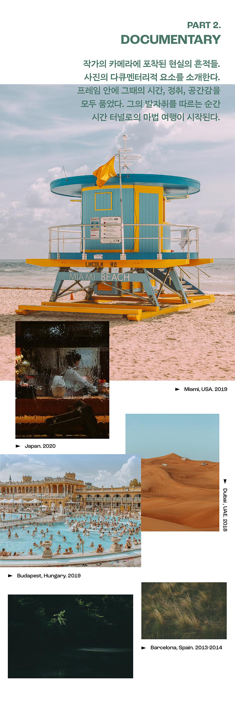 평범한 풍경과 장소를 부드러운 색감과 정갈한 프레임으로 담아낸 사진들로 그만의 예술적인 언어(표현)를 구축하였습니다. 주변 사람들에게 작품을 보여주기 위해 시작했던 SNS 계정에 전 세계 사람들이 몰리며 인지도를 얻기 시작해 킨포크, 비트라, 잭 다니엘 등 글로벌 브랜드의 러브콜을 받는 유망한 아티스트입니다.