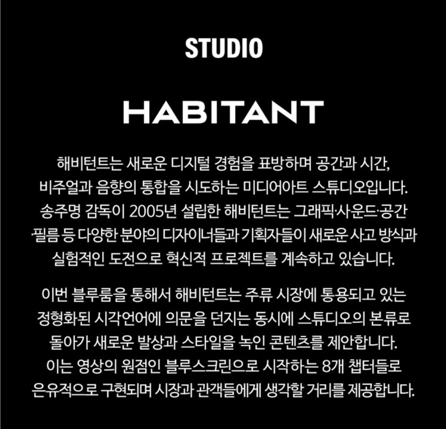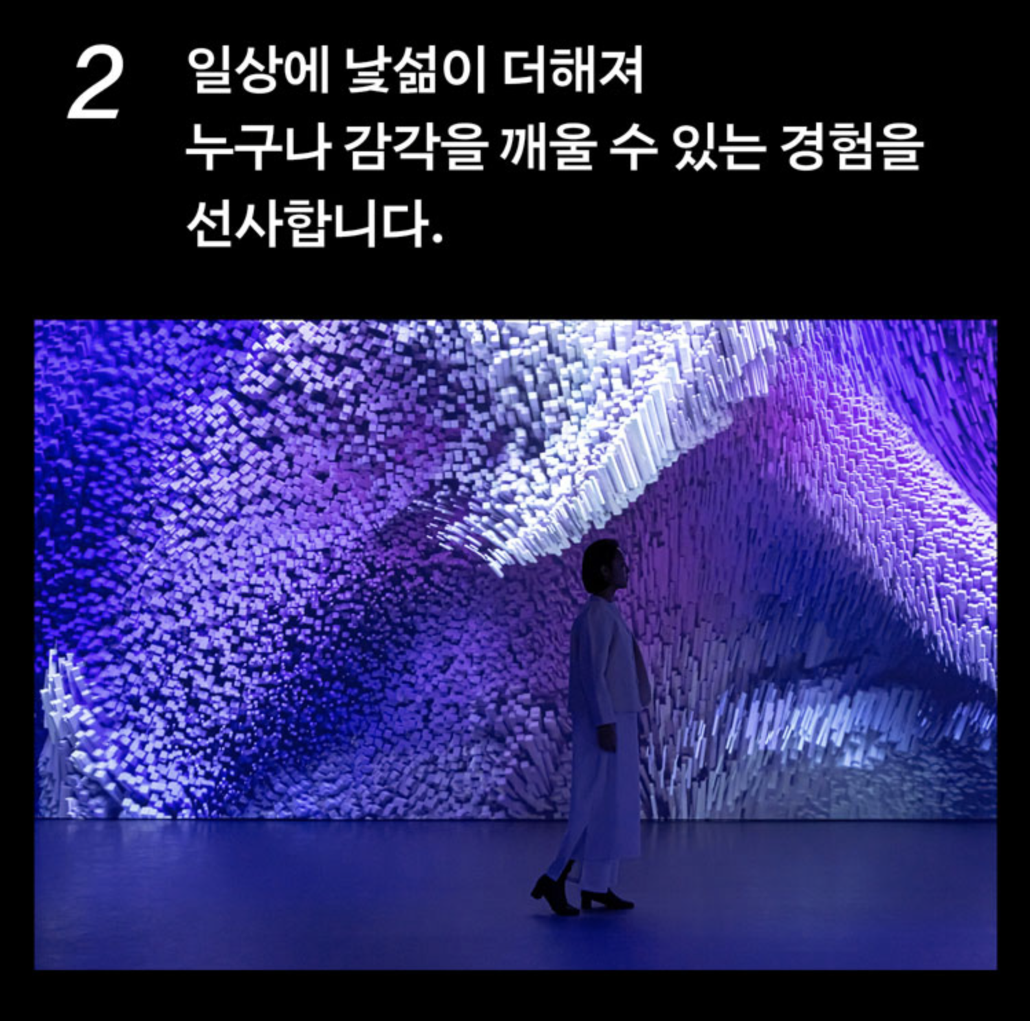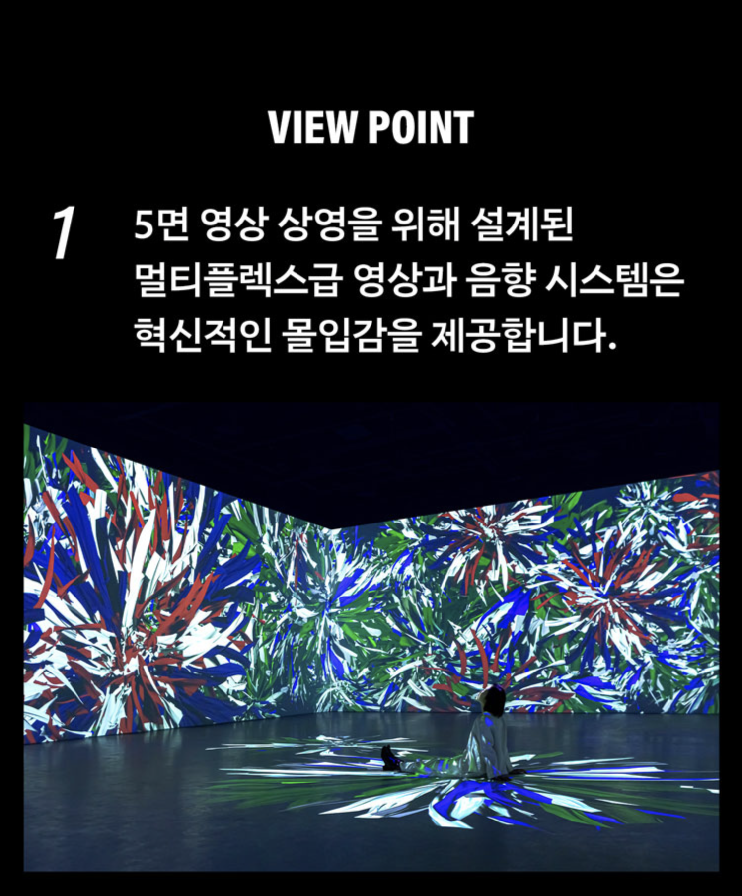 *전시장 내부가 어둡고, 사운드의 음량이 커 폐소공포증이 있거나 임산부, 노약자 등에 해당하는 분들은 입장 전 유의 부탁 드립니다.