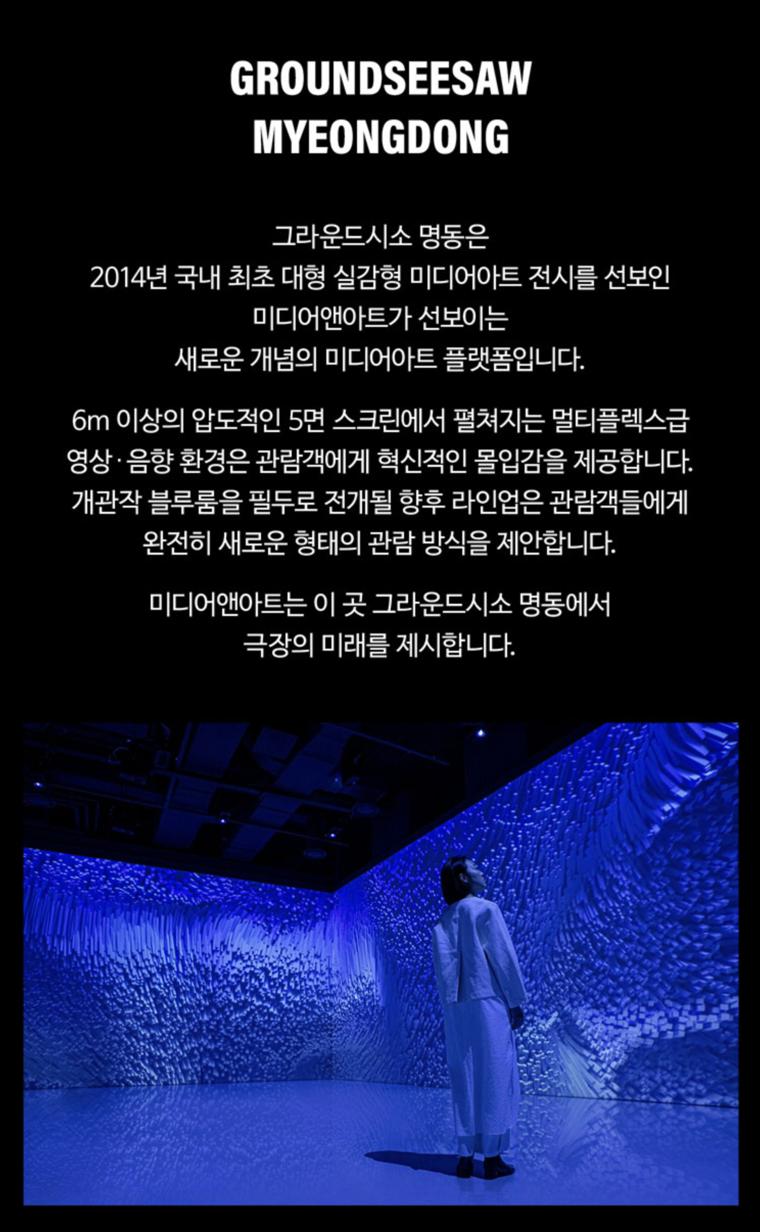 그라운드시소 명동은 2014년 국내최초 대형 실감형 미디어아트 전시를 선보인 미디어앤아트가 선보이는 새로운 개념의 미디어아트 플랫폼입니다. 6m이상의 압도적인 5면 스크린에서 펼쳐지는 멀티플렉스급 영상.음향 환경은 관람객에게 혁신적인 몰입감을 제공합니다. 개관작 블루룸을 필두로 전개될 향후 라인업은 관람객들에게 완전히 새로운 형태의 관람 방식을 제안합니다. 미디어앤아트는 이 곳 그라운드시소 명동에서 극장의 미래를 제시합니다.