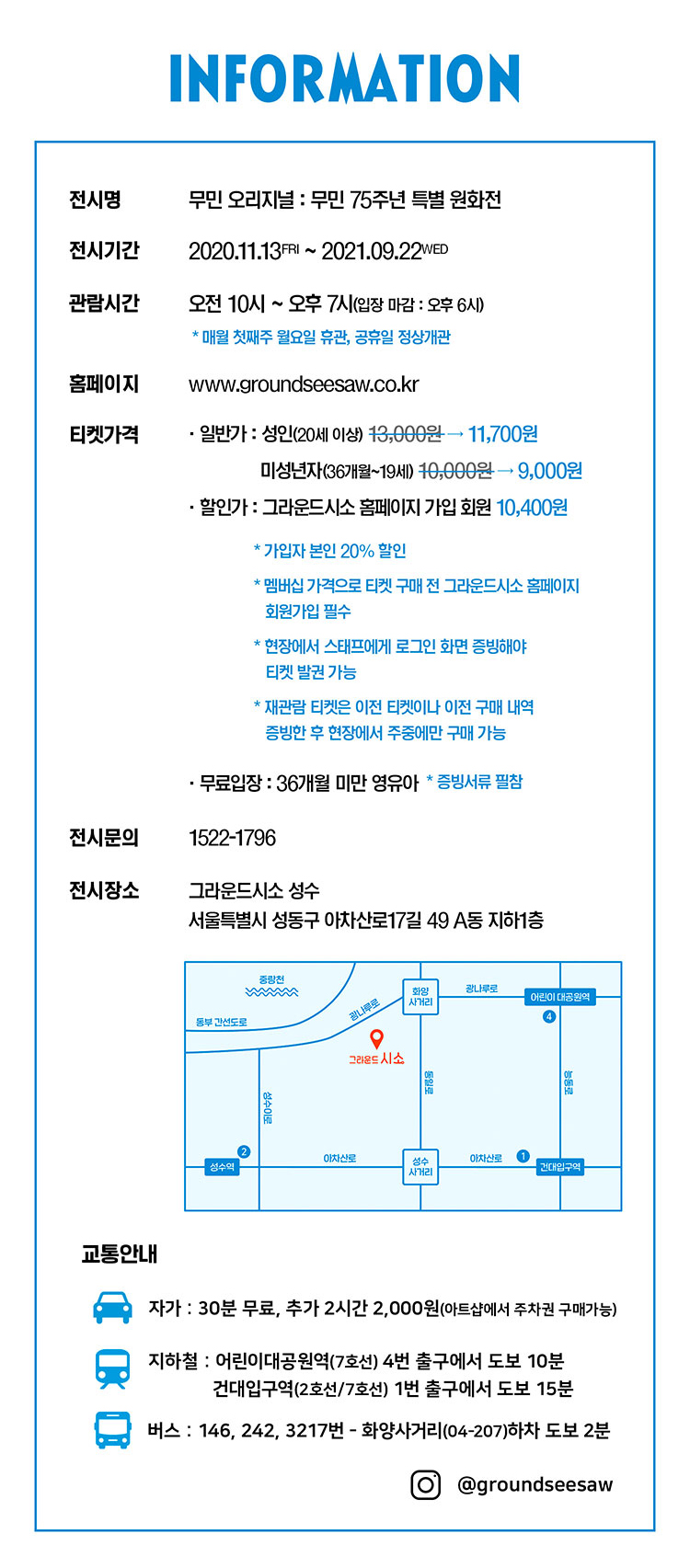 할인가 | 그라운드시소 홈페이지 가입회원 성인 10,400원 || 무료입장 | 36개월 미만 영유아 (*증빙서류 필참)
